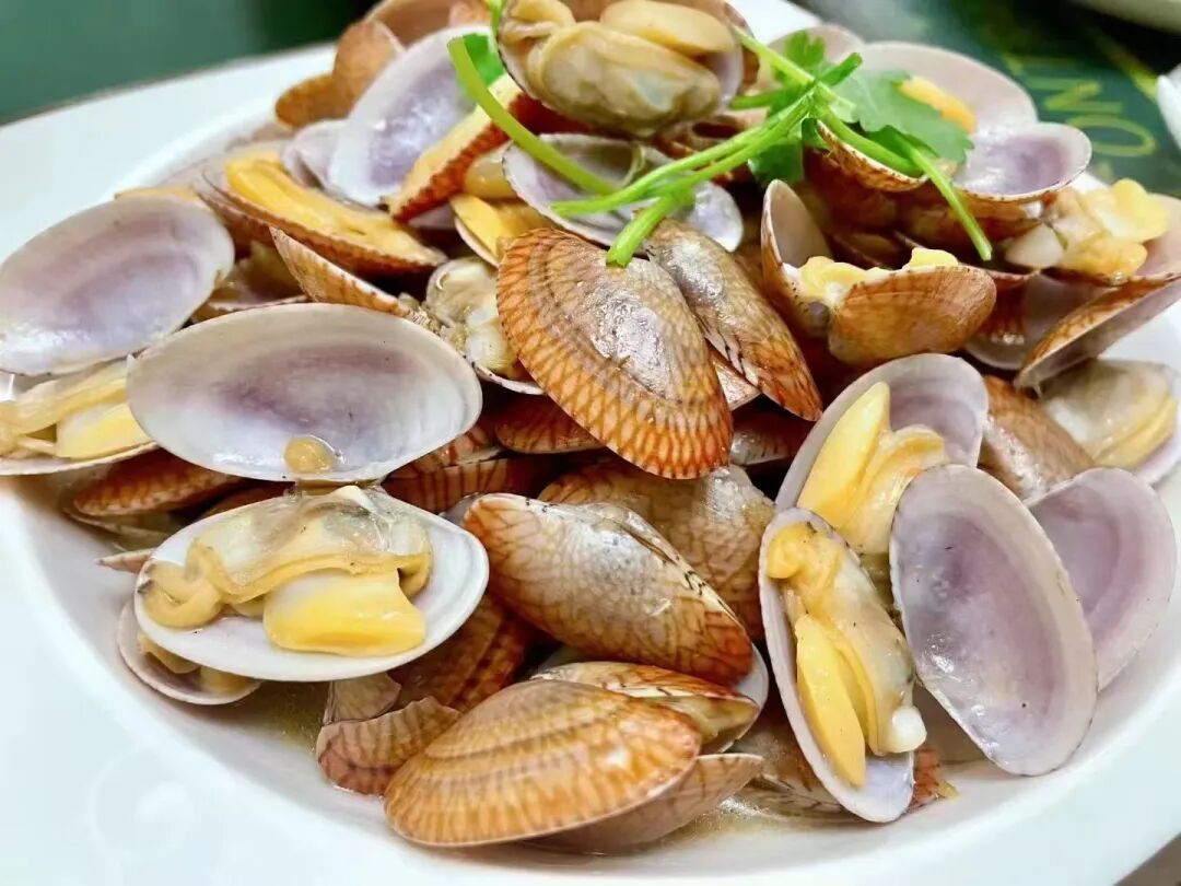 葱姜炒芒果贝:这道菜选用鲜活芒果贝,轻焯去沙,保留脆嫩本味;配老姜丝、小葱白爆香,旺火快炒,成菜贝肉弹润爽口,姜葱余香萦绕,清鲜不腻。