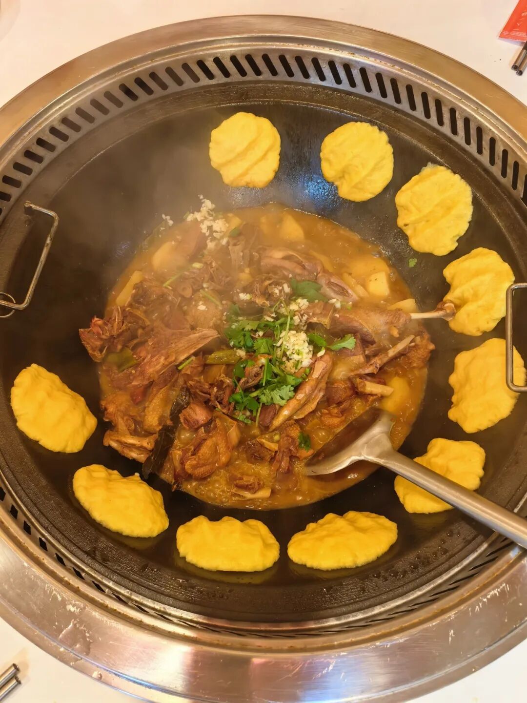 铁锅炖大鹅:现炖入味,鹅肉紧实不柴、酱香浓郁,吸满汤汁的锅边贴饼子外酥内软,一口肉一口饼,鲜醇暖胃超满足!