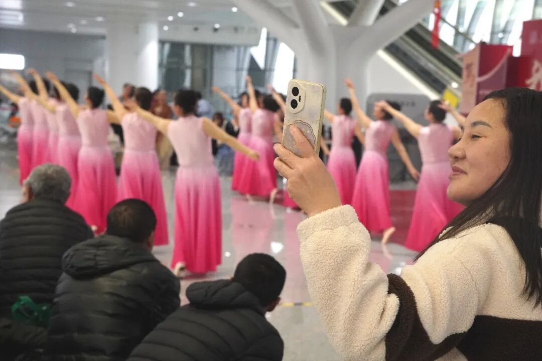 当动感十足的《健身气舞》展现刚柔并济之美,优雅的《玉兰花韵》舞出上海市花的清雅风姿,候车厅已化身临时剧场。演出最终在祝福满满的歌声《万事如意》中落幕,而温暖与惊喜已留在了旅客们的镜头里、笑语中,以及一条条正在刷屏的“朋友圈”里。