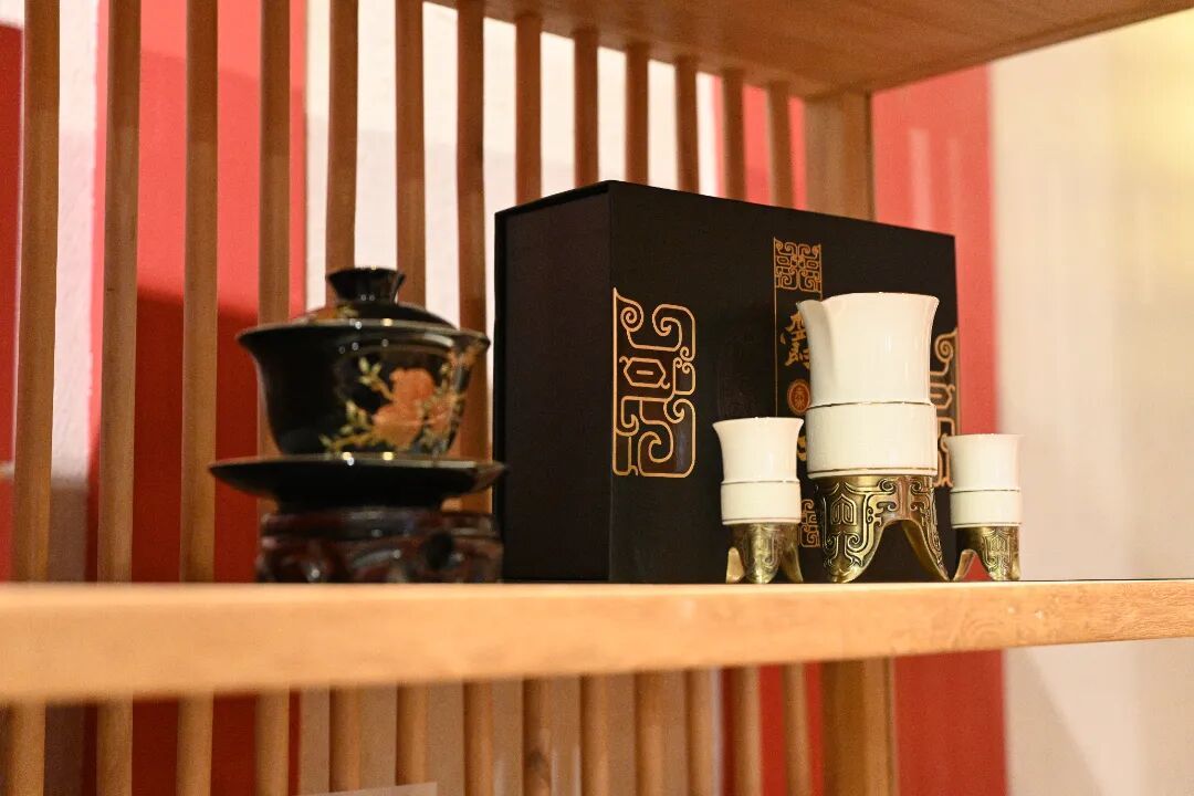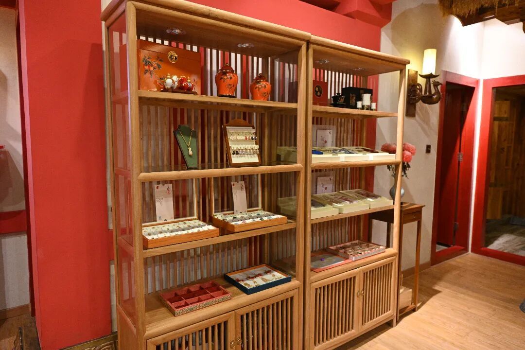 漫步陈列架前,欣赏宋锦首饰盒中精致的耳饰,或凝视陈列架上的瓷瓶、项链与茶具;