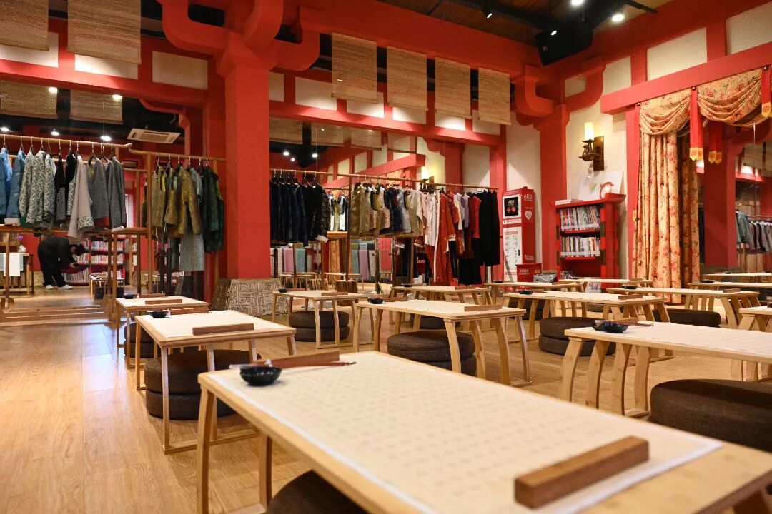 一走进服饰区,就被满目华服吸引。宋锦、汉服、新中式上衣……色彩明丽,纹样精致。