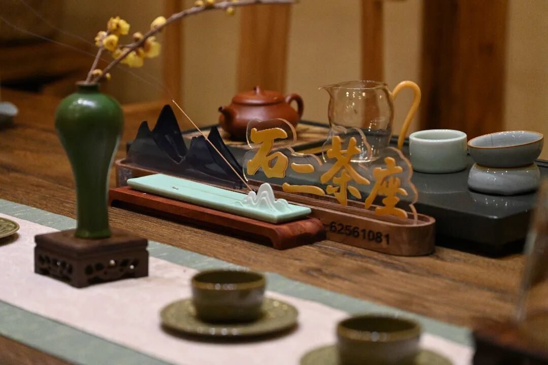 走进室内,更是处处见匠心:红色梁柱、木质矮桌、圆凳、壁灯与书架,勾勒出典雅的文化氛围;茅草屋顶、木质桌椅、“河图”匾额,仿佛步入一座小小的江南园;连茶桌上“石二茶座”的字样与茶具的摆放,都透着中式生活的仪式感。