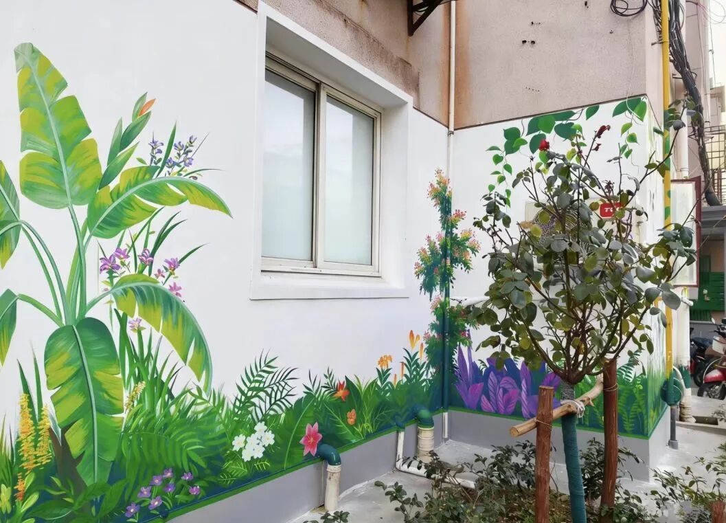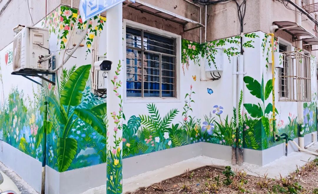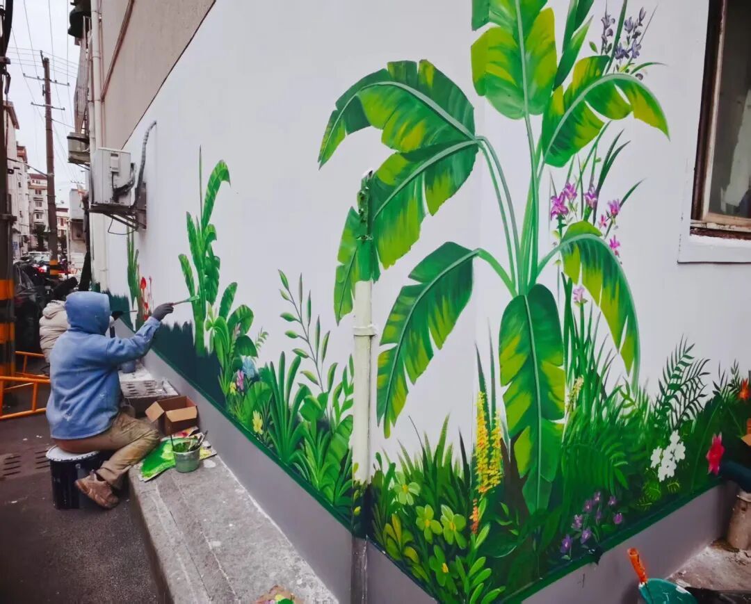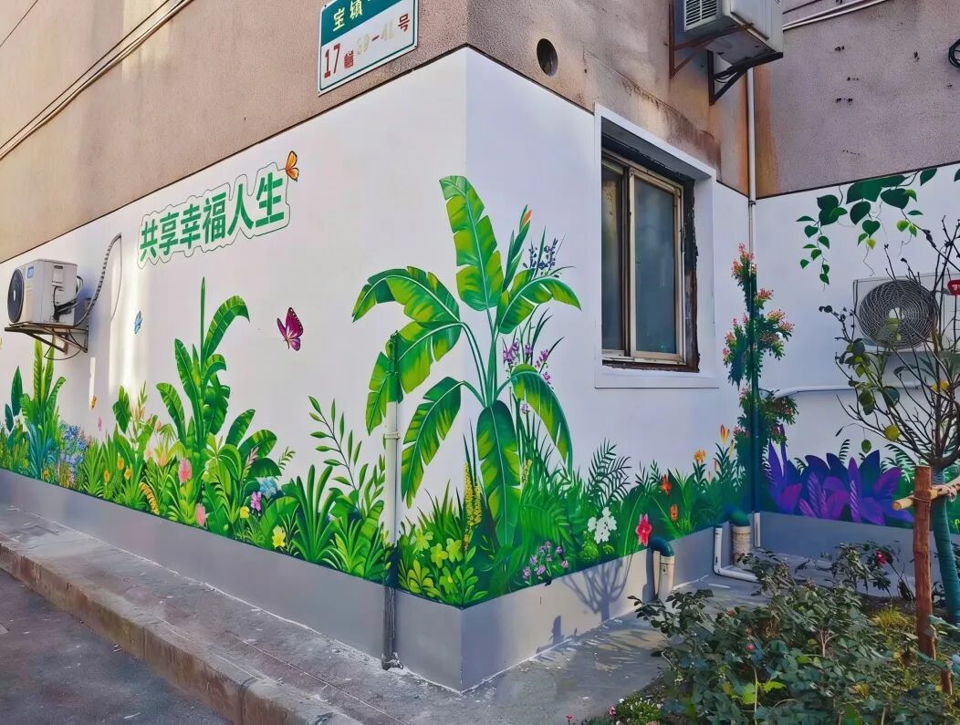 “以前这面墙就是单调的白灰墙,现在画上了宝山滨江的风景和满眼的绿植,每天路过都觉得心情变好了!”家住宝山区友谊路街道宝城新村的施阿姨看着家门口焕然一新的墙面,笑着对邻居说道。