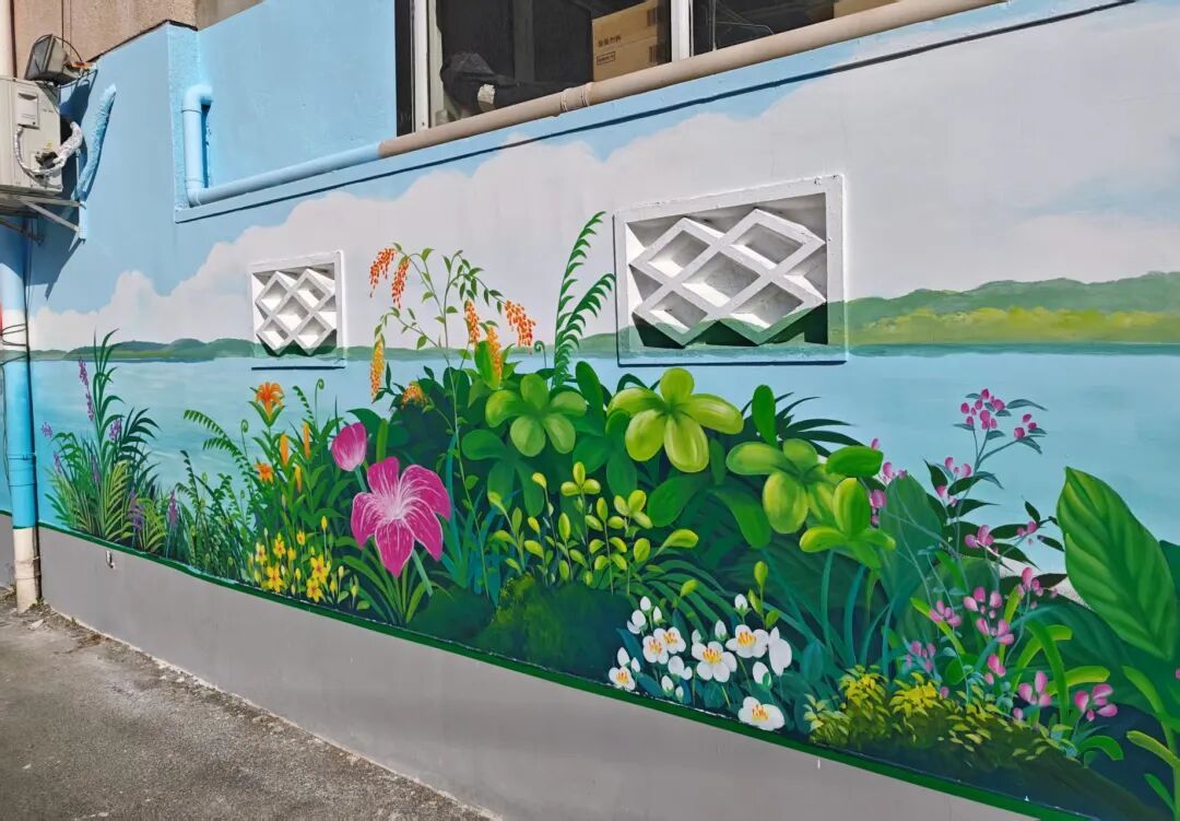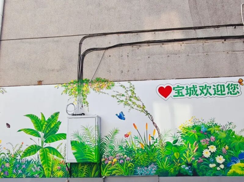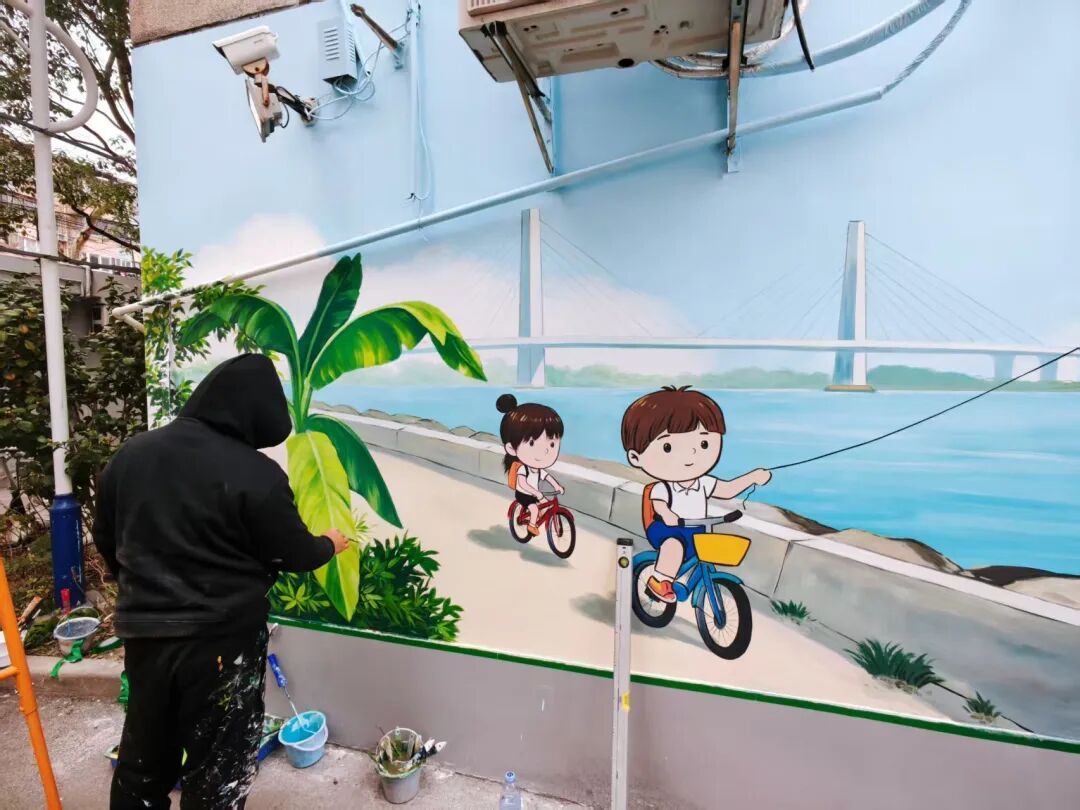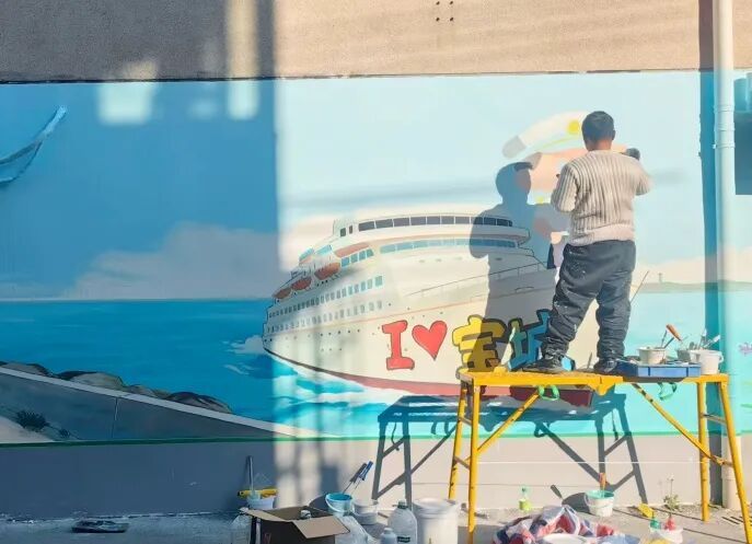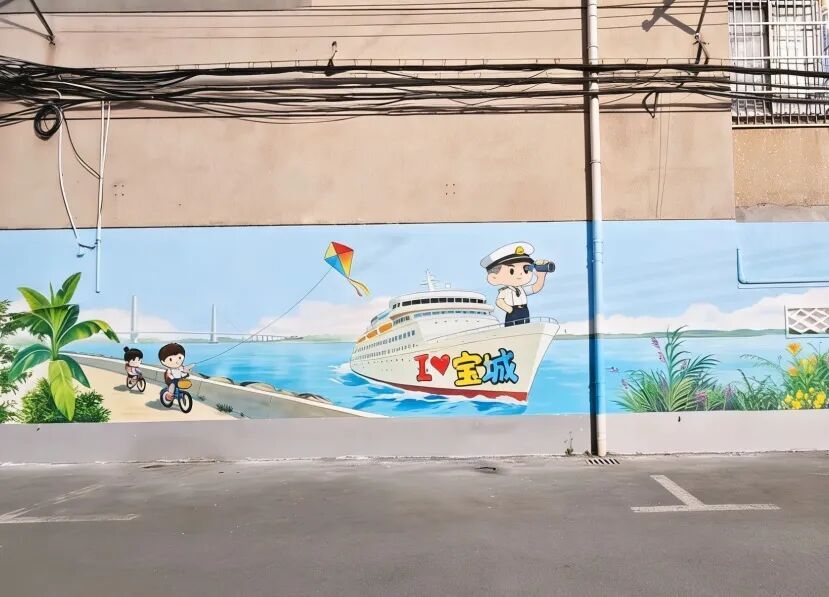 画师们充分吸纳居民代表提出的细节建议,将宝山滨江的标志性游轮、蜿蜒江堤,与层次丰富的城市绿植巧妙融合,以细腻笔触在墙面上铺展开一幅兼具艺术感与生活气息的生态画卷。