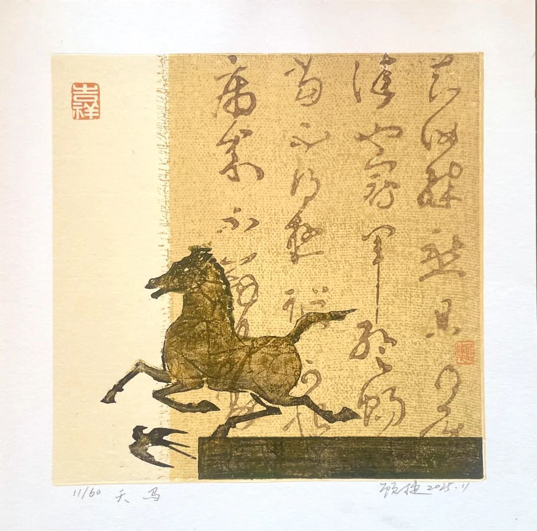 该作品采用传统油印工艺制作,通过五块底板套色印制而成。画面中,一匹骏马三足腾空,一足轻踏飞燕之背,造型动感凌厉,气势磅礴,生动诠释了“马踏飞燕”所蕴含的迅捷、勇毅与奋进精神。顾捷介绍,作品在设计稿与色彩选择上耗费月余,前后推敲数十稿,最终定下黄色的版本,极具古雅氛围。马匹采用黑色印制,再以金色复叠,增强层次感与金属质感,并运用柔纸法呈现马的纹理,形成铜铸般的立体效果,整体风格古朴厚重,别具韵味。背景则衬以奔放的草书,笔触经放大镜精勾细刻,与画面主体形成“软硬相衬”的独特艺术效果。