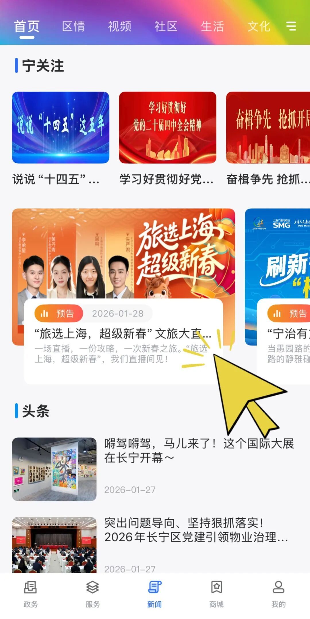 2.在App首页点击下图中黄色箭头所指页面,即可收看直播。
