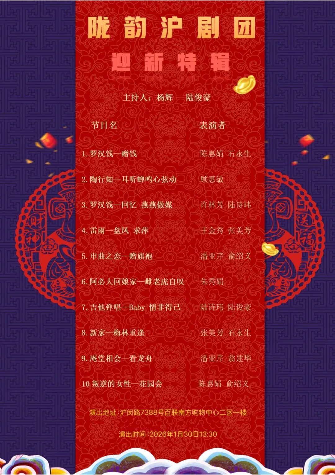 1月30日—2月1日,作为闵行区“春申美好生活迎新季”的启动活动,“益”马当先 幸福陇上闵行区“我们的节日·春节”主题示范活动将在百联南方购物中心二区举办!详情→“春申美好生活迎新季”启幕!购好物、闹新春、看大展、趣体验,闵行都安排!(附折扣清单) 作为活动之一,一场浸润本土风情的沪剧盛宴即将暖心开演!1月30日13:30—15:00,梅陇镇陇韵沪剧团携新年专场演出登陆百联南方购物中心二区1楼,以经典乡音贺岁迎新,可免费参与,更有年味市集同步开放!快和亲朋好友共赴这场老少皆宜的文化之约吧! 陇韵沪剧团成立于2018年8月,现有36名团员,含2名劳动模范,数十年坚守初心,不计回报深耕沪剧传承。剧团每年完成60余场演出,涵盖上海市沪剧节、市民文化节等大型活动及社区、养老院巡演,场场爆满,广受好评。 资料图片 本次新年专场演出精选《赠钱》《看龙舟》等节奏欢快的经典短段,贴合新年氛围。12岁少年与专业演员同台演绎《燕燕做媒》,“以老带新”展现传承力量。由16岁少年担任主持人,围绕“说好沪语”开展趣味互动,让方言文化活起来。更有儿童吉他弹唱融入沪剧旋律,实现中西艺术碰撞,兼顾传统韵味与青春活力。 年味渐浓,好礼将至!年味市集将诚意开市!今年的市集集购物、抽奖于一体!活动中,热风、巴黎贝甜、仲景、不逗猫、大塚食品、避风塘、悠纯牧业、澳乐维他、红法贸易等十余家口碑企业,将带着“当家精品”惊艳开摆。 各家主推品齐亮相:进口红酒、美味面包、营养坚果、牛肉咖喱即食包、上海葱油酱、香菇酱、佛跳墙大盆菜、水牛奶等诱人美味。 任意消费,可参与惊喜抽奖:热风满499减50的消费券、精品红酒双支礼盒、咖啡随行杯、鲍鱼鸡翅汁捞饭料、认养纯奶、巴黎贝甜饼干等多重好礼等您带回家! 无需购票,免费参与! 1月30日13:30, 来百联南方购物中心, 逛年味市集、赏沪剧经典, 在熟悉的乡音中 感受传统艺术的当代魅力, 让全家共度一个 充满文化气息的新春佳节~ 转载请注明来自今日闵行官方微信