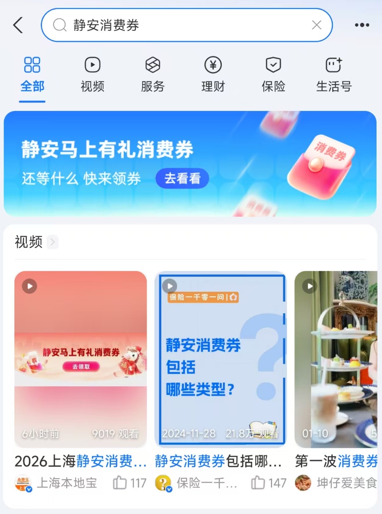消费券仅支持上海静安区参与活动的商户使用(商户详见支付宝消费券活动页面);