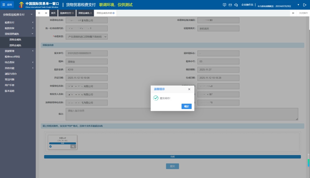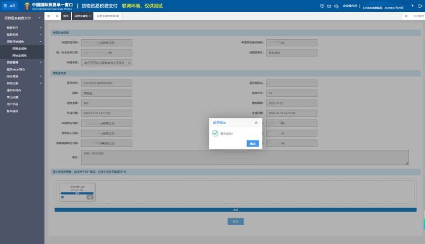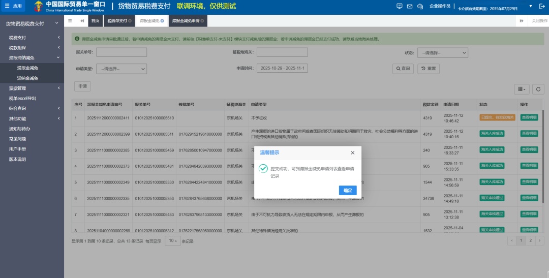 3、系统提示“提交成功,可到滞报金减免申请列表查看申请记录”。