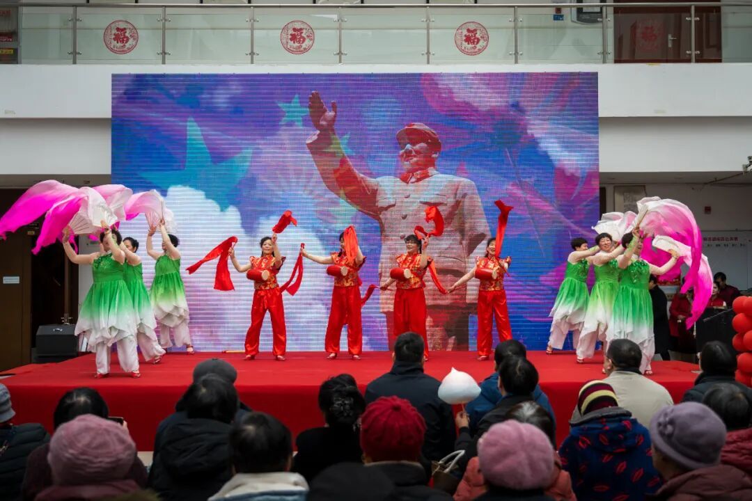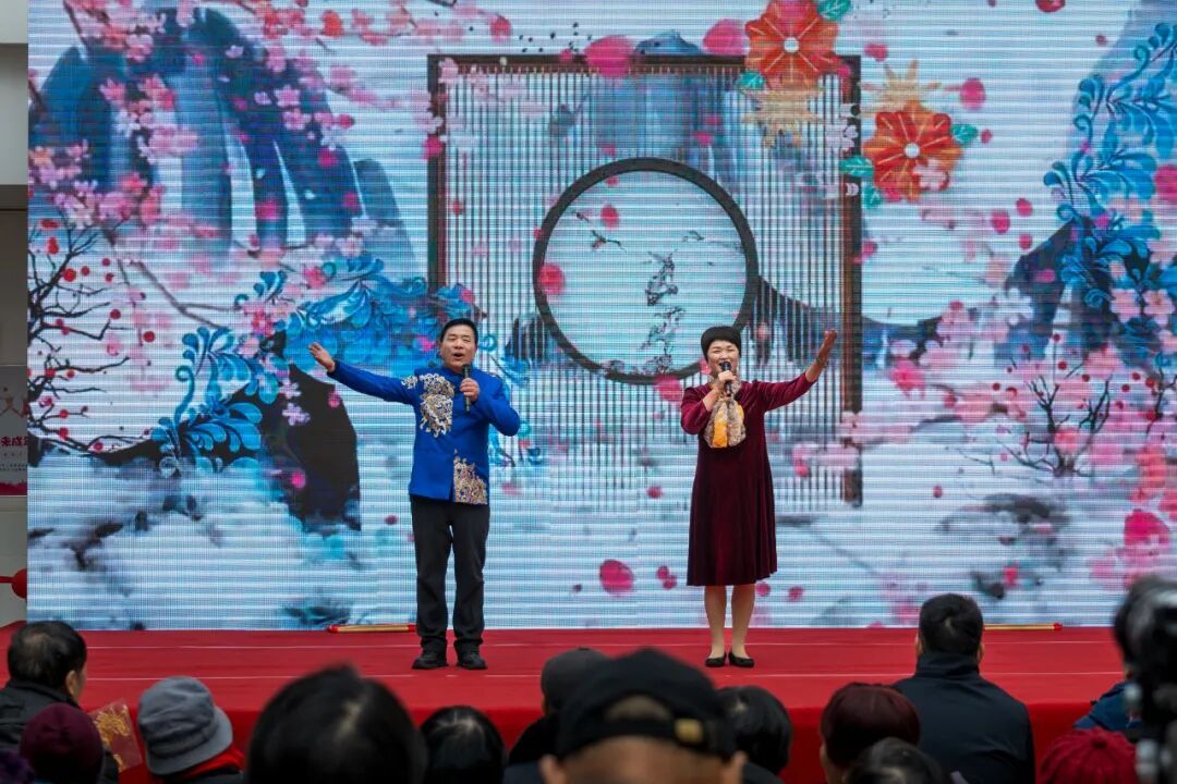 舞台一侧,笔墨飘香,红纸铺展,写春联、画年画、剪窗花的区域始终围着热情的居民。一副副满载祝福的春联,一张张精巧别致的窗花,在人们手中诞生,最传统、最真挚的新春祝愿也被居民陆续带回家中。