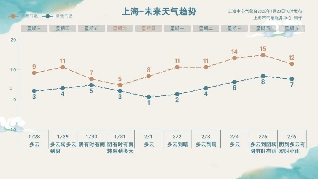 今天(1月28日)申城多云,受辐射降温影响,早间气温较低,大部分郊区最低气温在-3~1℃之间。今天白天暖阳相伴,气温有所上升,最高气温在9℃左右,风力减小,东北风3~4级,午后体感比前两天温暖一些。