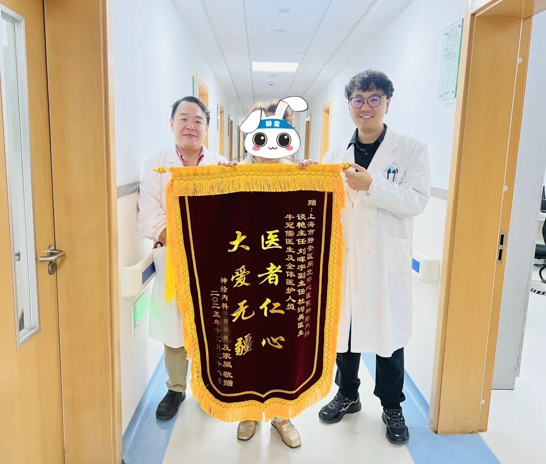 临行前,患者家属将一面写有“医者仁心,大爱无疆”的锦旗送到医护人员手中,激动地说:“幸亏在上海遇到了你们这些好医生!”