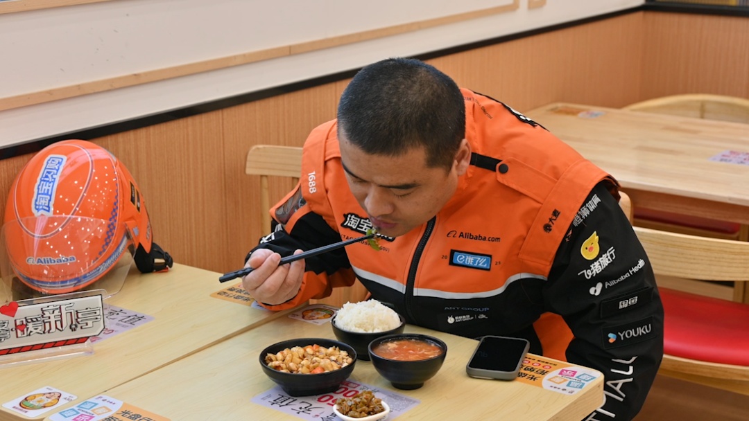 外卖员李先生点了“宫保鸡丁套餐”,并在店内找了个位置坐下。饭菜端上来,热气氤氲,他顾不上多说话,先吃了几口。