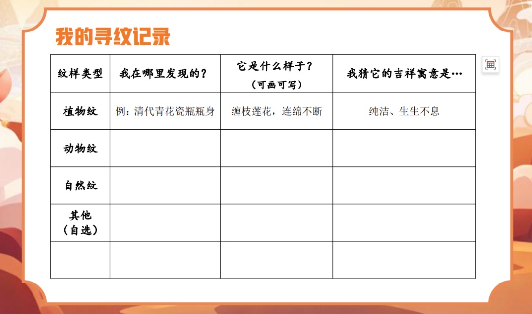 在展品中找寻植物纹、动物纹、自然现象纹,想一想,古人为什么喜欢把这些自然元素画上去?从找到的纹样中汲取灵感,进行组合或创新,设计一个压岁包,为最想祝福的人(如家人、朋友)设计一套专属纹样。