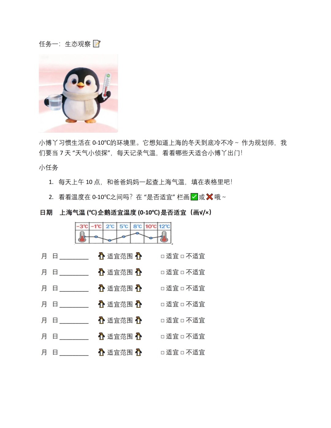 三年级学生将担当“生活小顾问”,结合非洲企鹅的生活习性,为它规划健康作息并设计一套健康操。