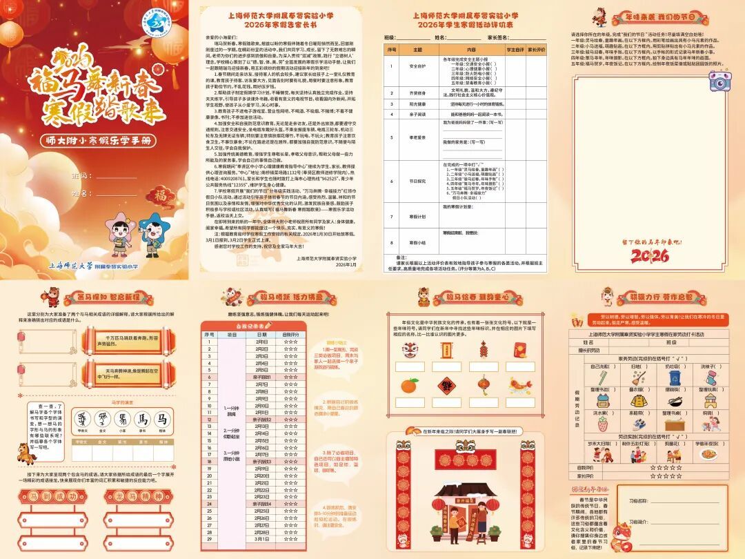 寒假期间,上海师范大学附属奉贤实验小学以“福马舞新春,寒假踏歌来”为主题,深耕“五育融合”,精心打造集趣味性、实践性、年俗味于一体的专属寒假乐学手册,让学子在浓郁的新春氛围中踏歌研学、乐享成长。