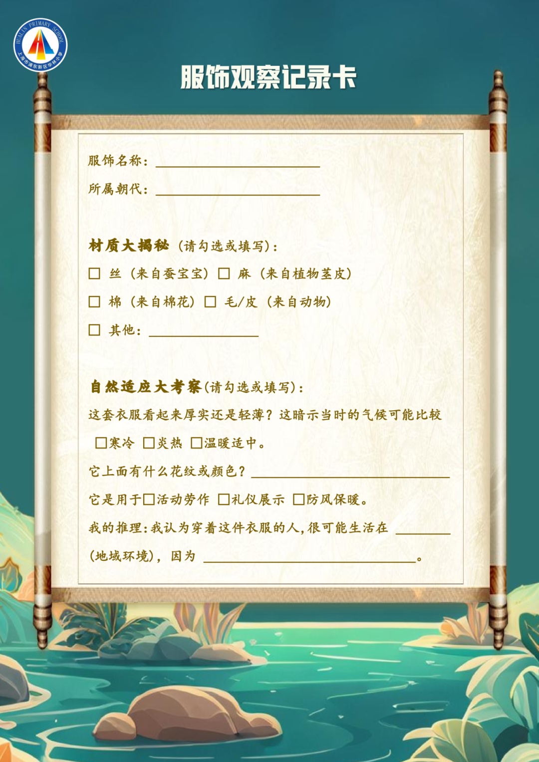 仔细观察一件古代衣物或画像,猜猜看,它的主要材料是什么?根据衣服的厚薄、款式,猜猜看穿它的人可能生活在温暖的南方还是寒冷的北方?思考分析这件衣服是怎么帮助古人适应不同季节和天气的?录制一段短视频,像博物馆讲解员一样,向大家介绍这件服饰:可以在博物馆现场讲解,可以利用家中材料模仿穿搭,也可以画出服饰示意图后讲解细节。