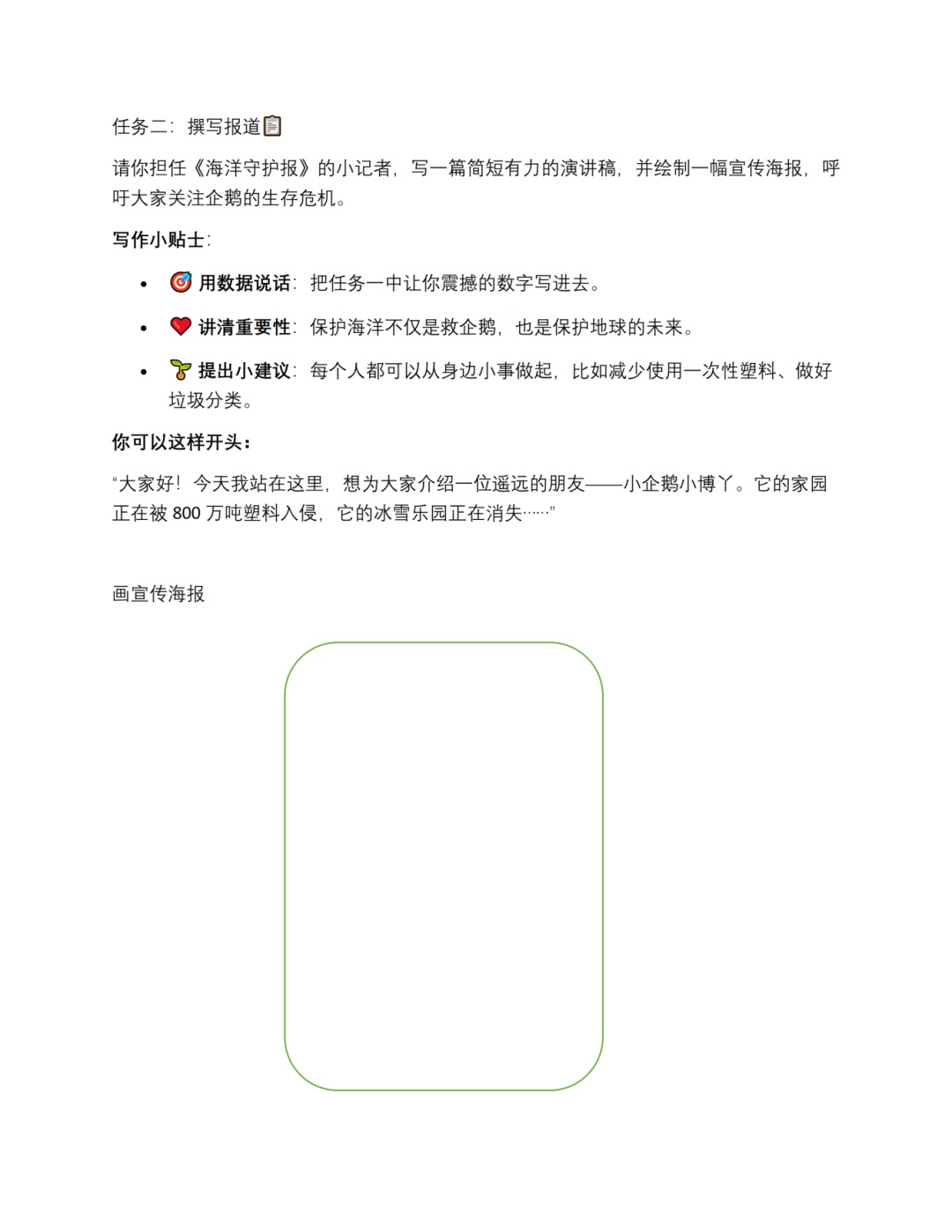 四年级学生将变身“保护宣传官”,撰写演讲稿、绘制宣传海报,呼吁大家守护企鹅家园。