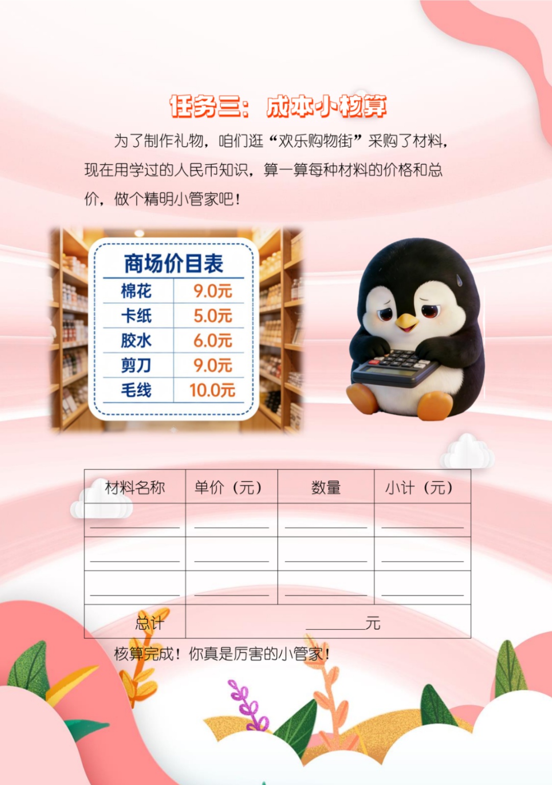 二年级学生将成为“创意小管家”,为小博丫制作冬日温暖礼物,过程中还要进行礼物制作成本核算。