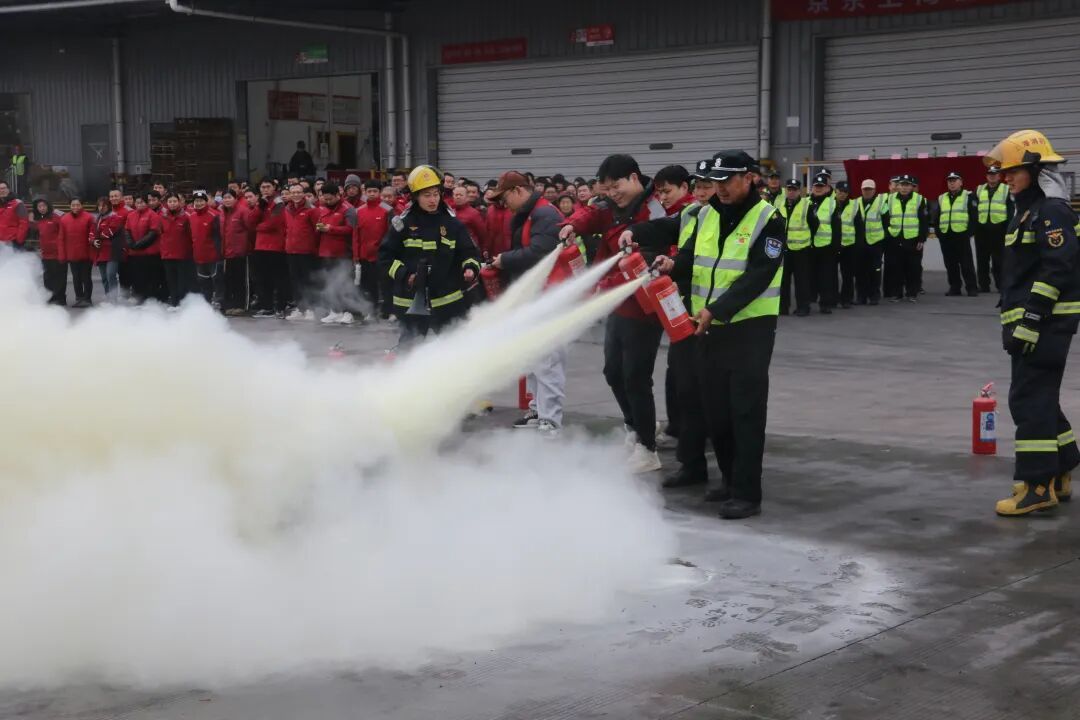 演习现场,来自娄塘消防救援站和嘉定工业区消防专职队的消防员首先讲解了灭火器操作口诀——“提、拔、握、压”,并演示水带连接墙式消火栓出水等基础消防技能。参训员工在指导下轮流进行实操,成功扑灭模拟火源。