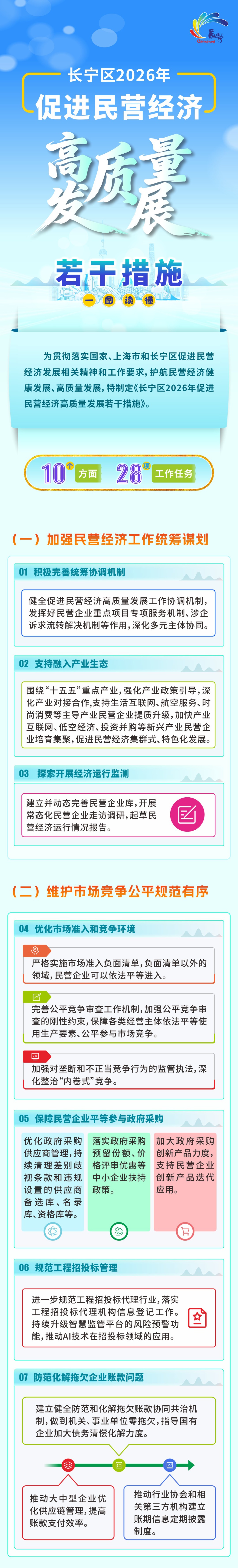 民营经济是长宁经济发展的“压舱石”和重要支柱。截至2025年底,民营企业占全区企业总数的76%;多家民营企业入围中国民企500强和上海民企100强;全区专精特新企业中,民营企业数超过九成。为了推动全区民营经济健康发展、高质量发展,在长宁区2026年优化营商环境暨促进民营经济高质量发展大会上,发布了《长宁区2026年促进民营经济高质量发展若干措施》,聚焦10个方面、28项任务,一起来看↓