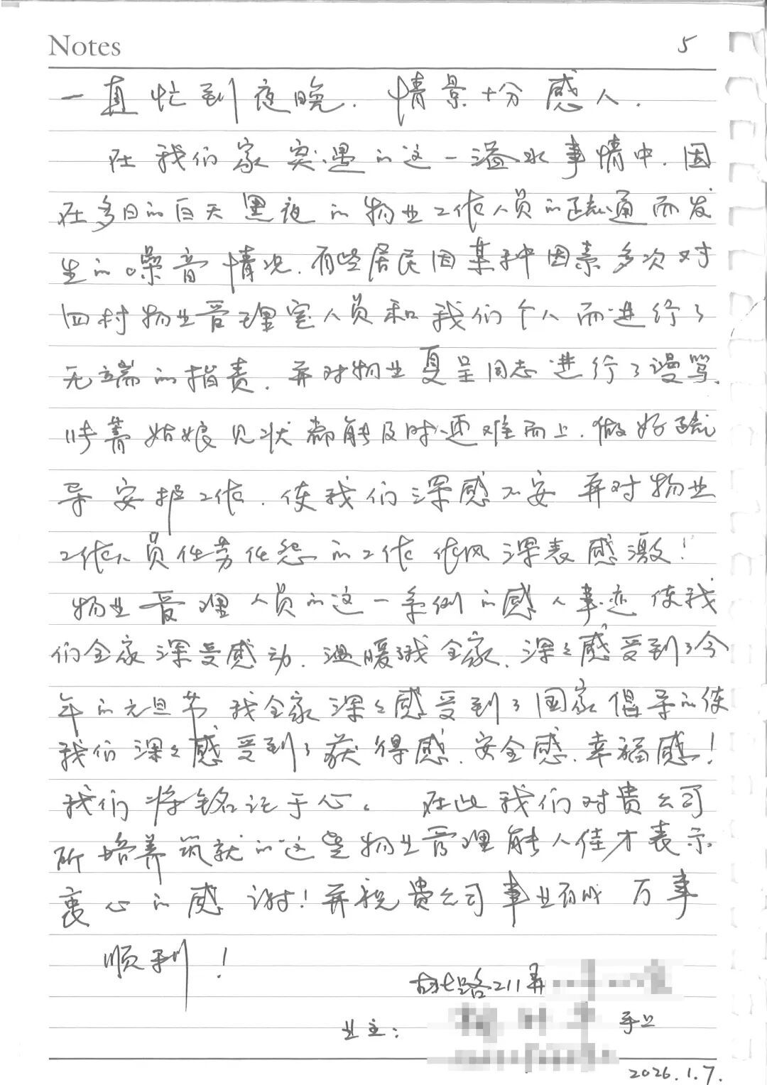 近日,家住新风小区的鞠先生将一封感谢信和一面印有“排忧解难敢担当,尽职尽责有作为”的锦旗送到物业管理处,对于仙霞慧生活物业天山四村管理处团队以及维修人员的尽责担当和专业素养给予了充分肯定。 滑动查看更多 原来在2025年底,鞠先生因卫生间马桶污水反复返涌问题向物业管理处进行了报修。在接到报修后,管理处工作人员和维修人员多次上门,尝试各种方法进行疏通,但都无法彻底解决这一问题。 后来,经过两位工程维修人员再次对一至三楼进行勘察,判断问题根源为地下管道破损,需对101室天井和102室地面进行开挖并更换相应管道。随后,在经小区“四位一体”审批通过的基础上,物业管理处按相关流程推进后续维修工作。 在后续的沟通协调过程中,管理处和工程维修人员向101和102室居民详细说明了问题情况、维修方案和施工流程,耐心倾听并记录诉求。经过多次深入沟通,最终各方就施工时间、施工顺序、善后工作等达成了一致。施工当天,管理处团队全程参与了现场的协调保障,及时处理各类突发问题,协助工程维修人员当天就完成了管道更新及善后工作。楼上楼下的居民对于维修结果和物业管理处的责任担当和专业高效给予了高度评价。 仙霞慧生活物业天山四村管理处将始终秉承红色物业惠民宗旨,聚焦业主居民迫切需求和急难愁盼问题,以更强担当和更优服务,努力提升业主居民获得感、幸福感、安全感。