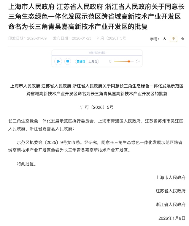 近日,上海市政府网站发布一则批复,上海市人民政府、江苏省人民政府、浙江省人民政府同意“长三角生态绿色一体化发展示范区跨省域高新技术产业开发区”命名为“长三角青吴嘉高新技术产业开发区”。