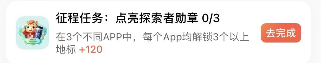 当您在3个不同App中分别解锁3个地标时,将一次性点亮“探索者勋章”,斩获丰厚融耀值奖励。随着解锁地标增多,还将点亮“一马当先”“千里马”等更高阶勋章,勋章还可用来兑换“终极豪礼”的抽奖机会。