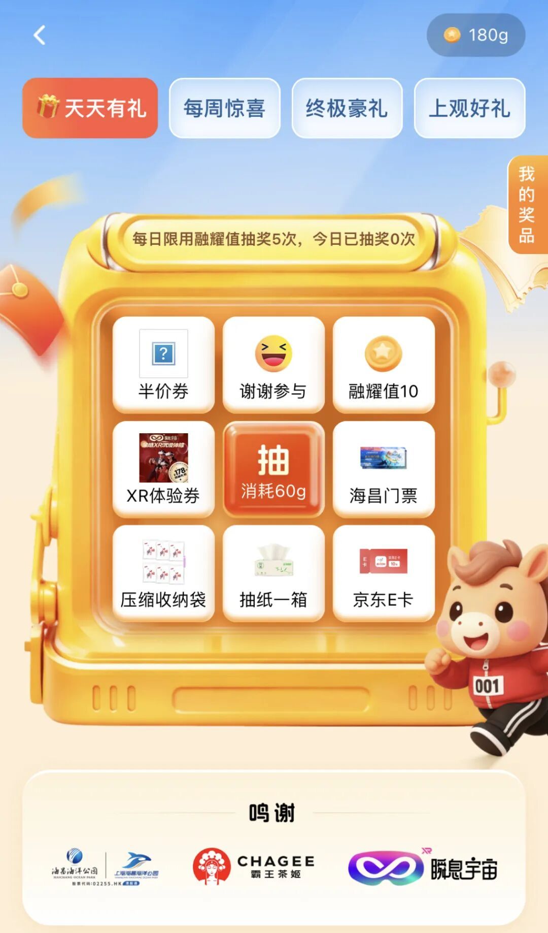 做任务攒下的“融耀值”,就是抽奖“入场券”。用户可以选择在“天天有礼”中每日打卡抽奖,也可以在“每周惊喜”开启时消耗分值参与限定抽取。