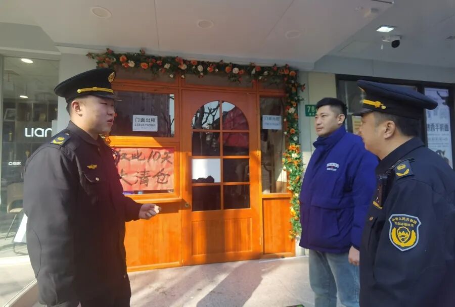 徐汇区生态环境部门执法人员和街道工作人员检查门店调整业态情况。 陈玺撼摄