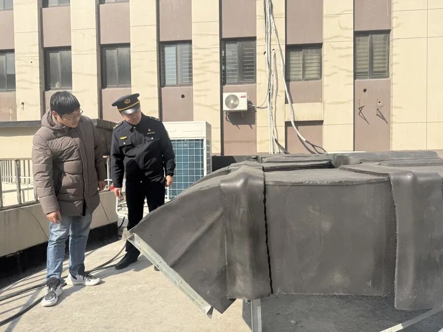 静安区生态环境部门执法人员和街道工作人员检查烟道和排放口调整情况。 陈玺撼摄