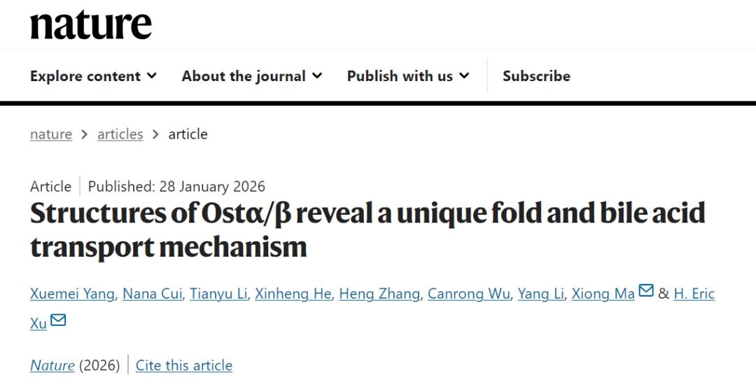 当地时间2026年1月28日,上海交通大学医学院附属瑞金医院医药结构生物转化中心、中国科学院上海药物研究所研究员徐华强等,在Nature杂志上发表了题为Structures of Ostα-β reveal a unique fold and bile acid transport mechanism的研究论文。该研究通过深度整合冷冻电镜结构解析、分子动力学模拟与电生理功能分析,系统揭示了Ostα/β的独特三维构象、底物识别模式与跨膜转运机理,为理解这一长期存在的机制问题提供了关键证据。