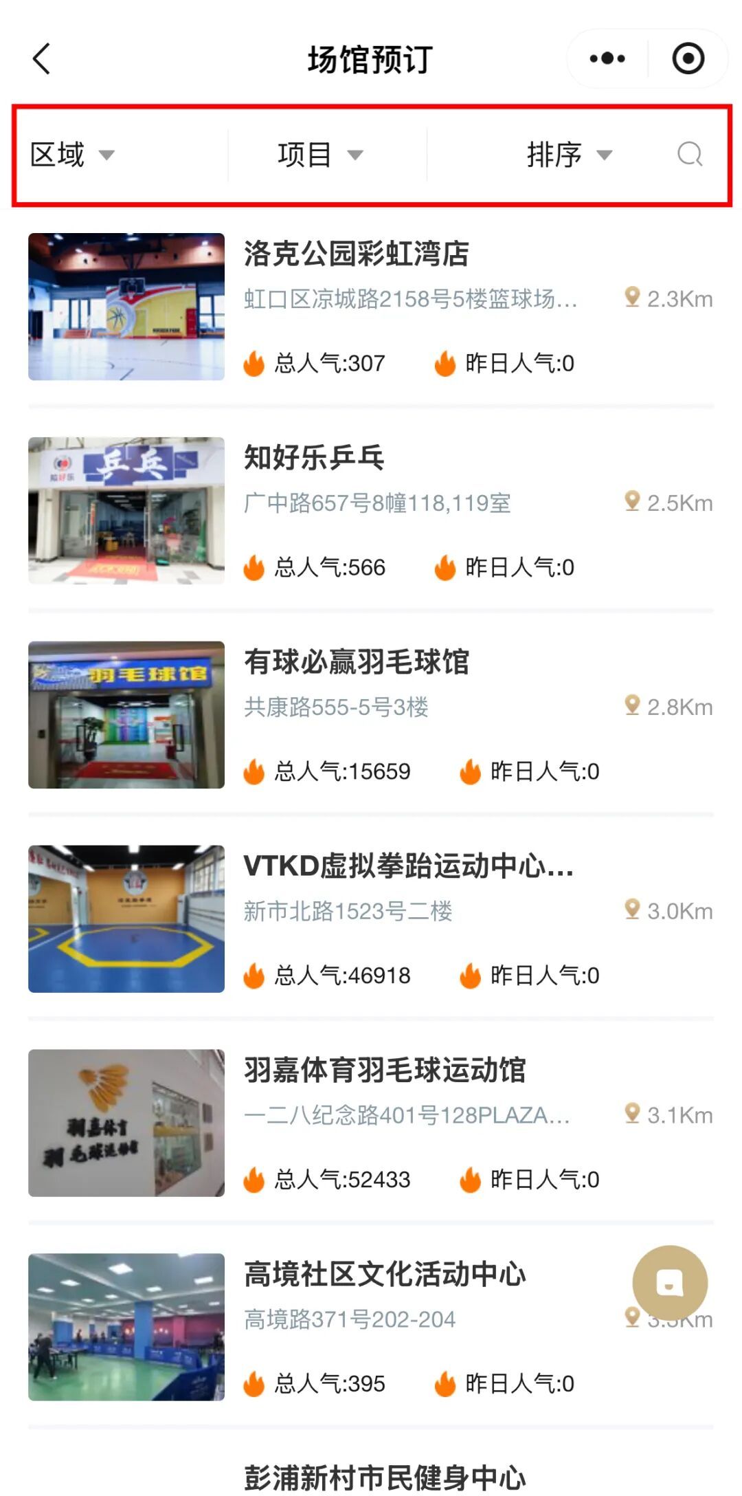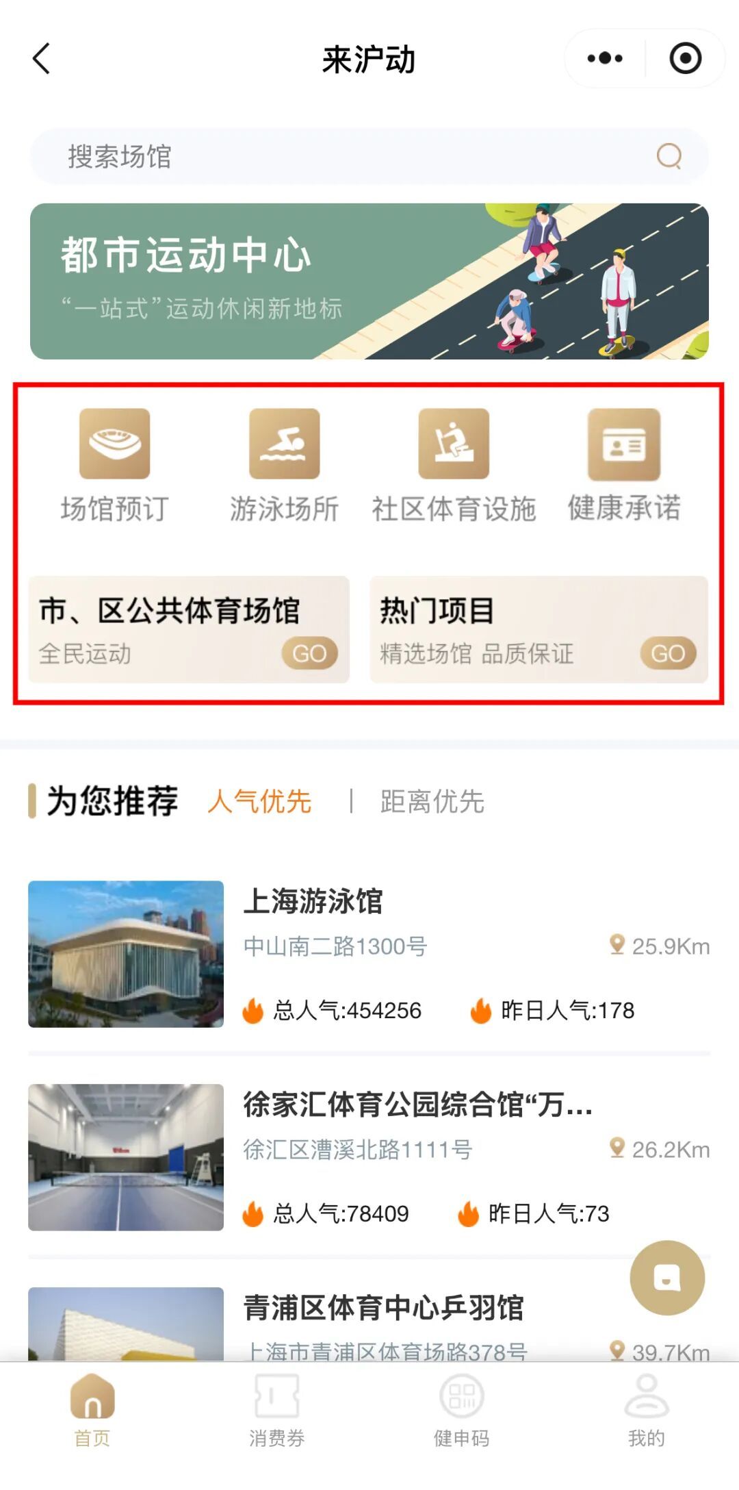 进入服务页面后,可通过“场馆预订”“游泳场所”“社区体育设施”和“市、区公共体育场馆”查询场馆信息及在线预约,或通过“热门项目”板块,按照运动类型选择场馆,还可以根据推荐选择热门运动场馆哦~