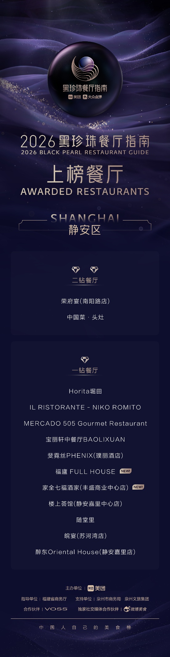 在2026黑珍珠餐厅指南中,上海共上榜61家餐厅,其中,三钻餐厅3家,二钻餐厅6家,一钻餐厅52家。静安区共有13家餐厅上榜,其中二钻餐厅2家、一钻餐厅11家,数量居中心城区前列。