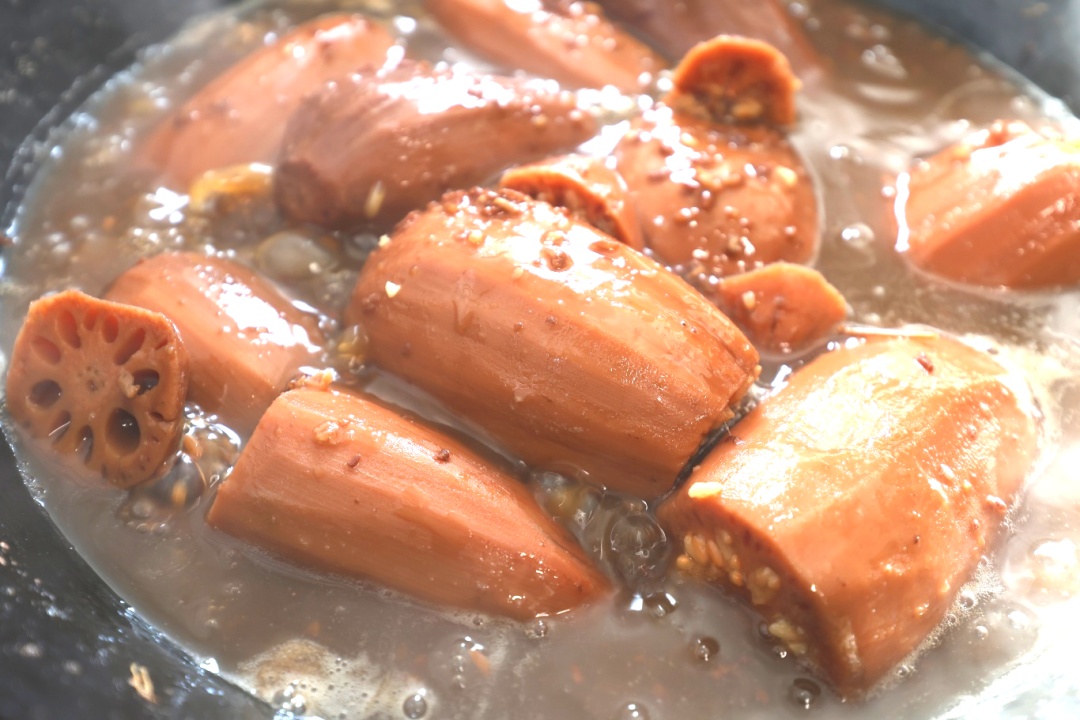 做桂花糖藕讲究慢工细活,藕填入泡发好的糯米,用牙签固定后,加冰糖、红枣慢煨两小时。