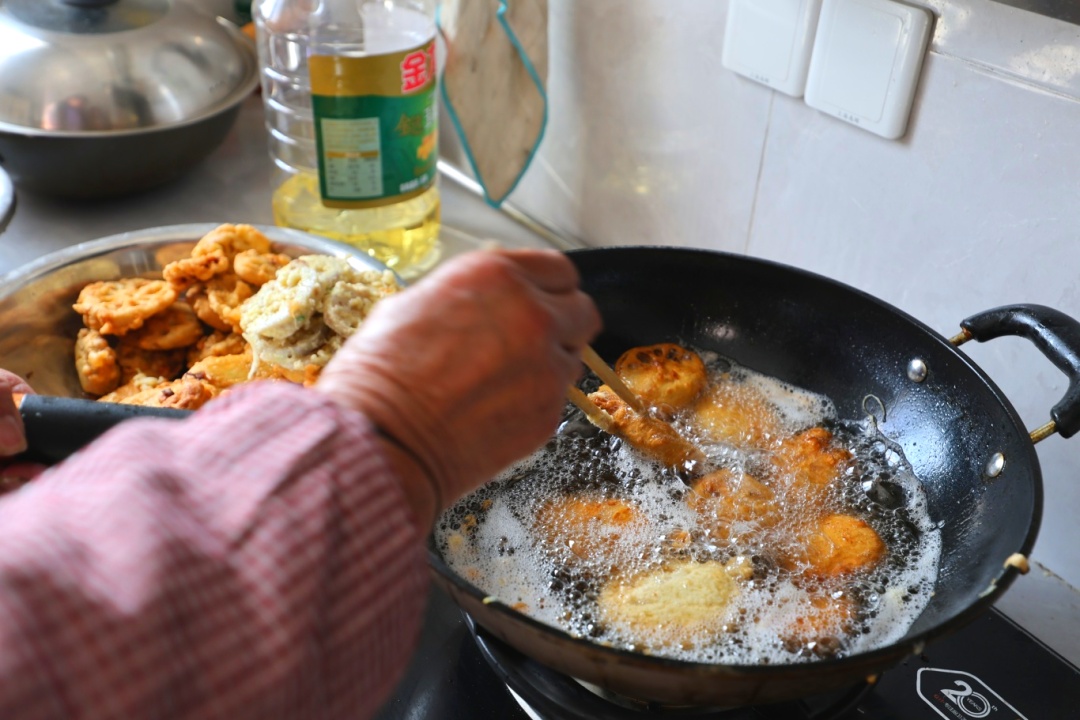 藕盒是年节里的鲜活烟火,藕切成连刀片,填入鲜香肉馅,依次裹上淀粉,入热油炸至金黄。