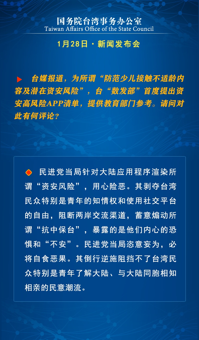 国台办:民进党当局渲染大陆应用程序“资安风险”暴露其内心的恐惧和“不安”
