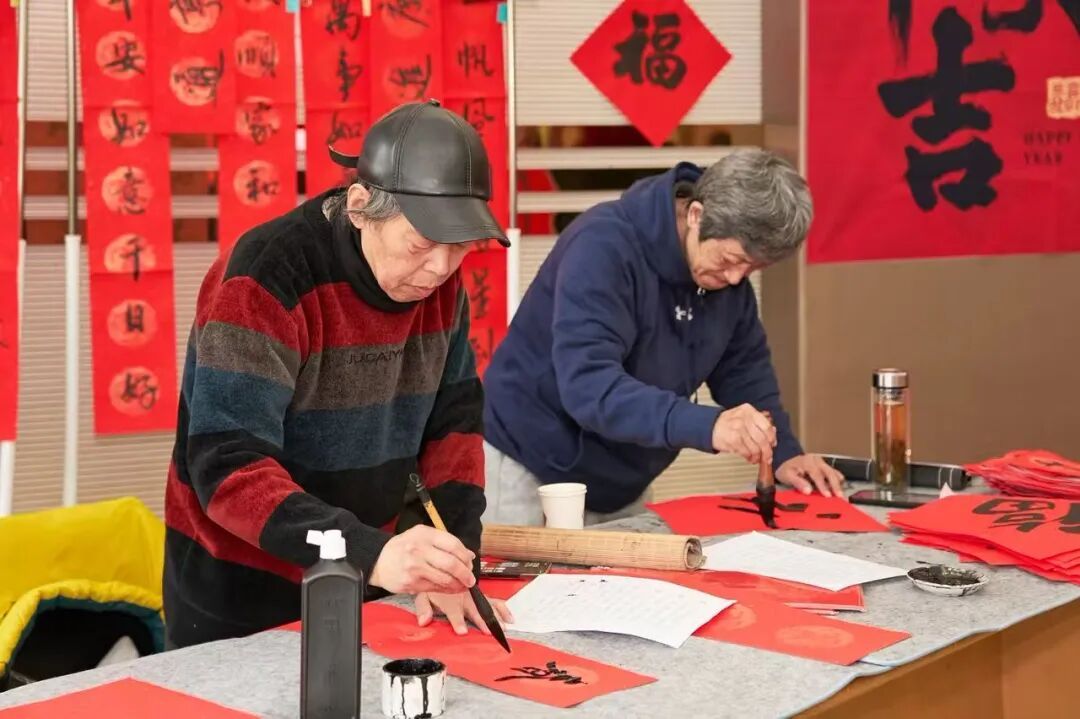 文艺汇演现场,“迎新春 送春联”公益活动同步升温。华泾书画社的老师们铺纸研墨、挥毫泼墨,将新春祝福凝于笔端。墨香与年味交融,尽显社区温情。