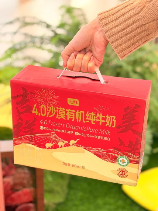 七鲜价格亲民,自有品牌“4.0g沙漠有机纯牛奶”,10盒仅售29.9元,每盒100毫升含4.0克原生乳蛋白,贴有专属电子身份证,有机可溯源。结合新春佳节,牛奶包装全面焕新,拎上一箱“红彤彤”,走亲访友“有里更有面”。