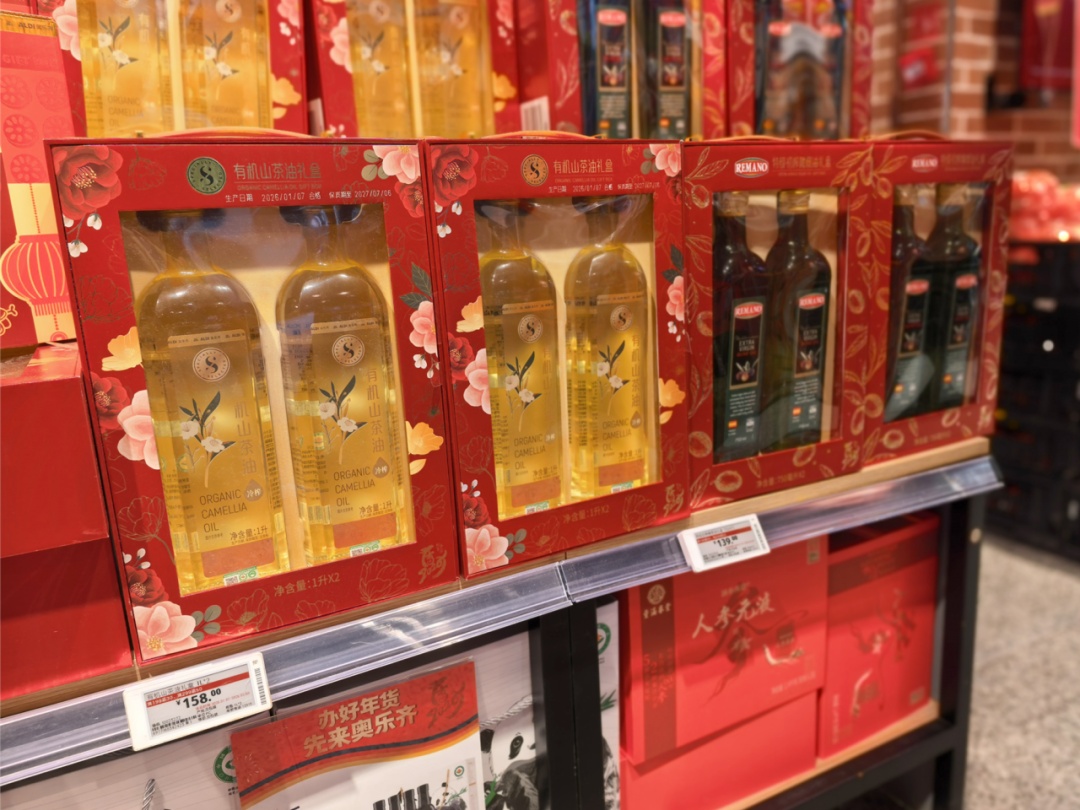 紧跟健康饮食消费趋势,各商超将消费者需求与年货研发相融合,推出了更受欢迎的新品。奥乐齐有机山茶油礼盒,选用贵州有机油茶籽,经物理低温冷榨锁住本味,0反式脂肪酸,烟点高适宜中式炒菜、凉拌等使用场景,尤其适合送长辈。