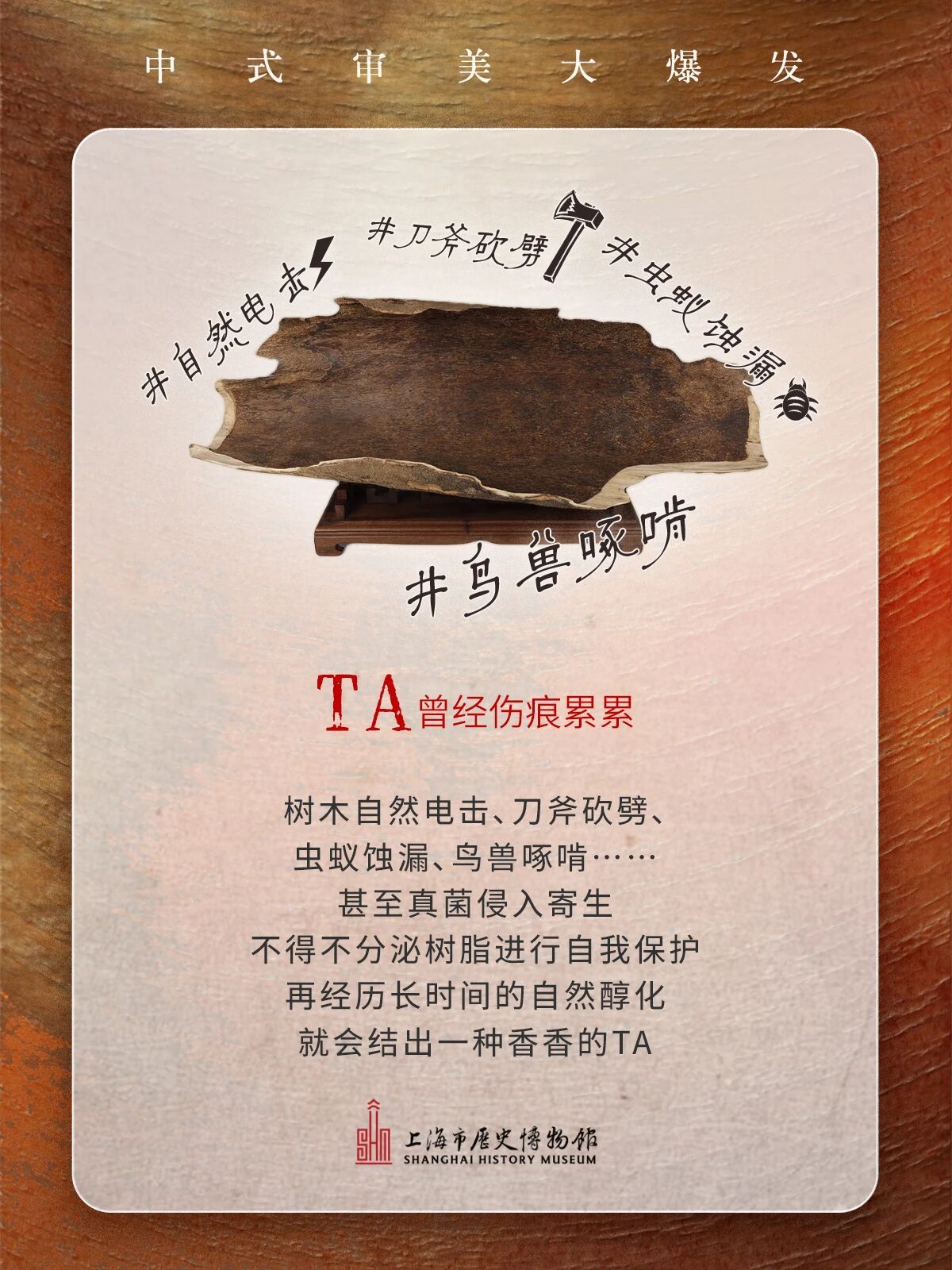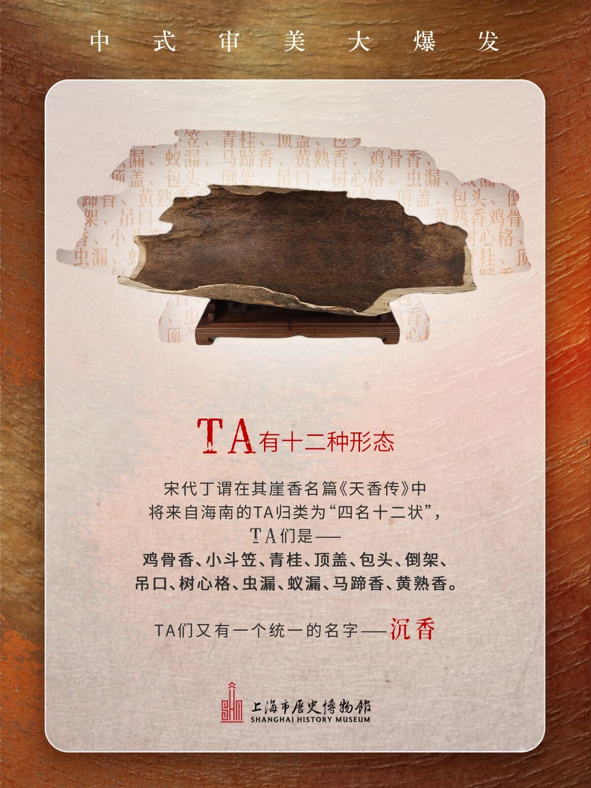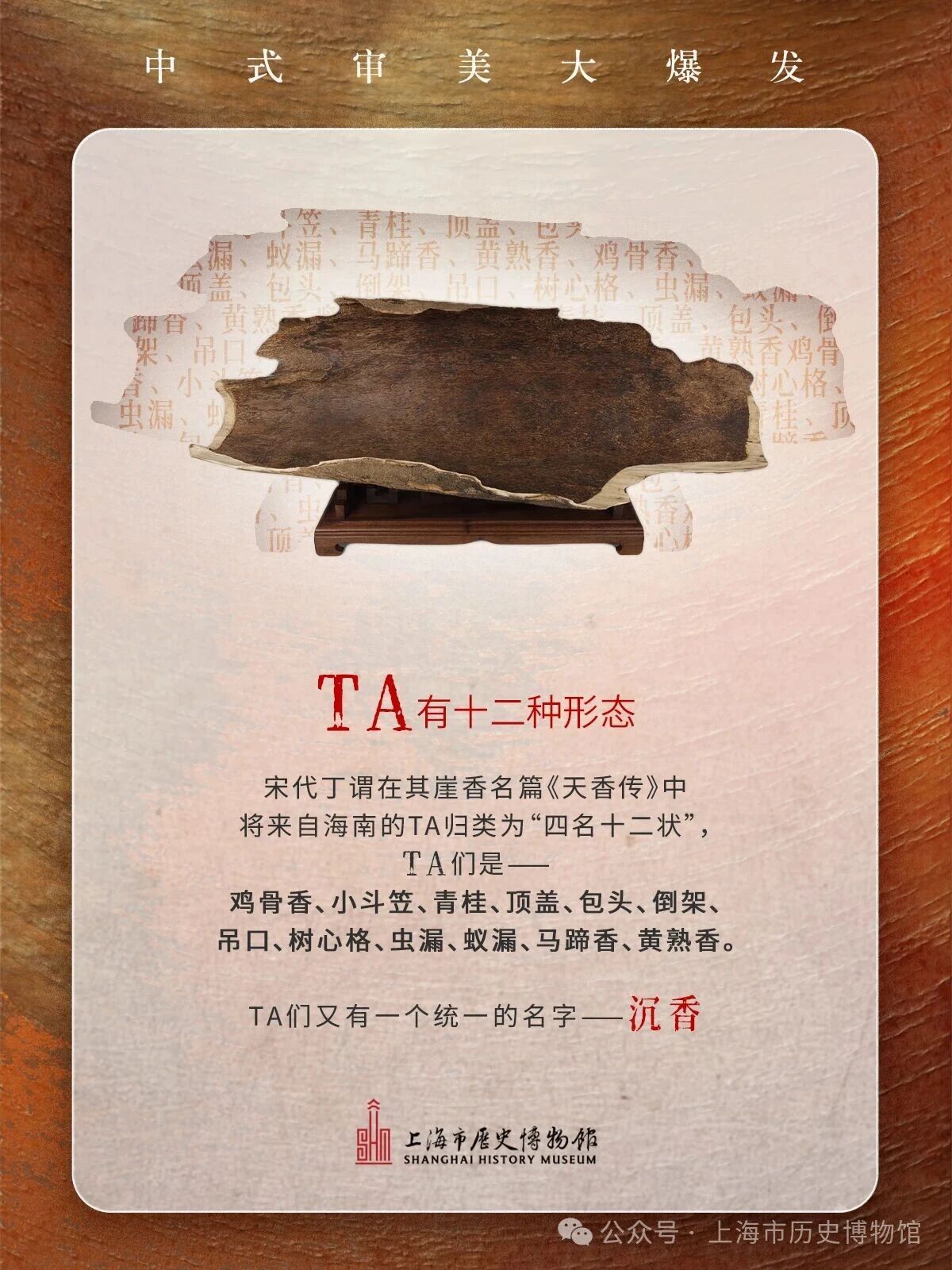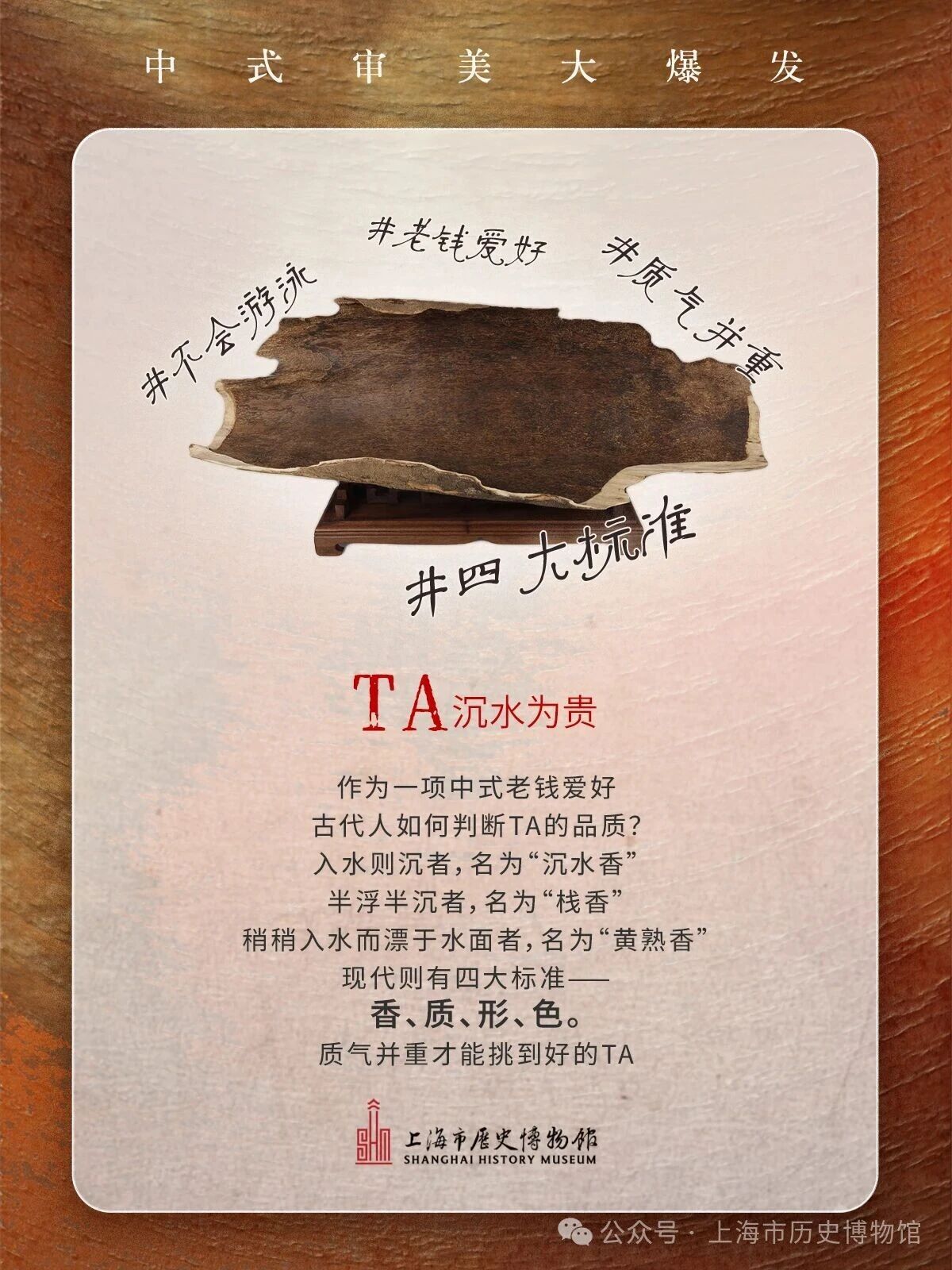 博物馆遇上奇妙的TA会有什么火花?趣味讲解让你秒懂——TA为何流行各个朝代,经久不衰甚至成为“老钱爱好”的标志TA出身朴实无华 历经无数关卡磨练在岁月里不断向下扎根治愈自己结成宝贵的“香膏”……想一睹TA的真容?就来上历博西楼二楼看展吧“观香——海南沉香文化展”互动体验 近距离品味岁月幽香#上海在这里 #上海在这历#沉香 #浪漫生活的记录者 #香文化 #中式DNA动了#上海免费展 #理想香气艺术生活