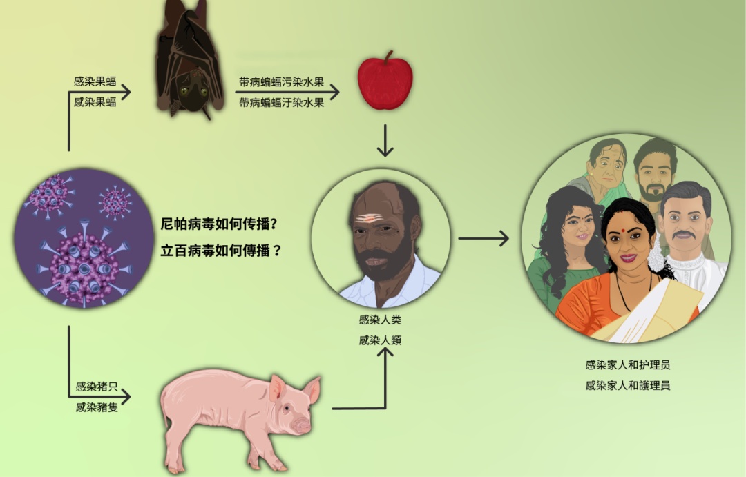 ▲动物传人(主要途径):直接接触被感染动物(如果蝠、猪、马等)或其体液(血液、尿液、唾液)。食用被病毒污染的食物,特别是被果蝠尿液或唾液污染的生椰枣汁、水果。
