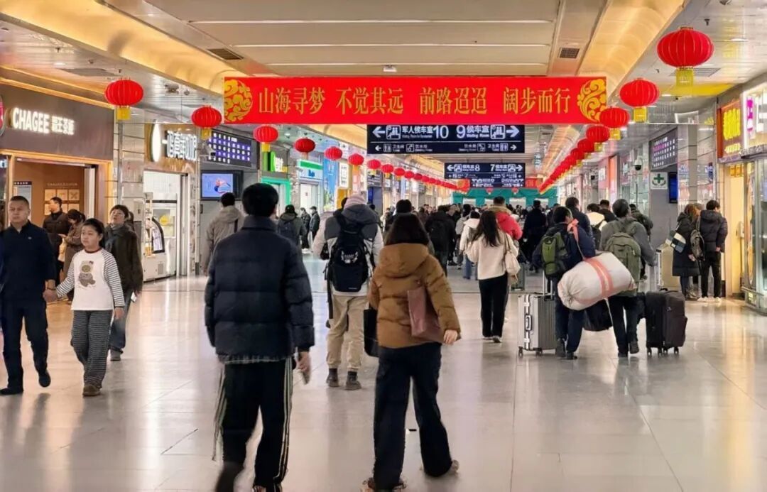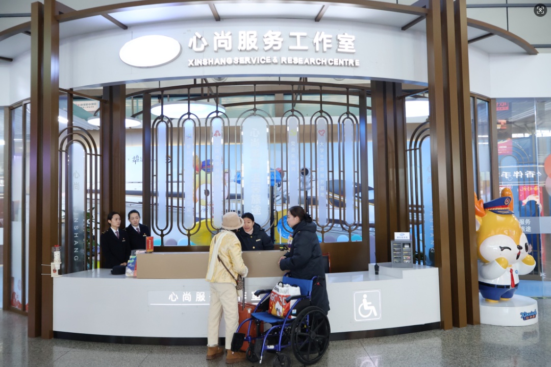 各站区悬挂红灯笼、中国结,设置春节主题景观、马年旅客打卡点,广播播放年味乐曲,显示屏滚动新春视频;