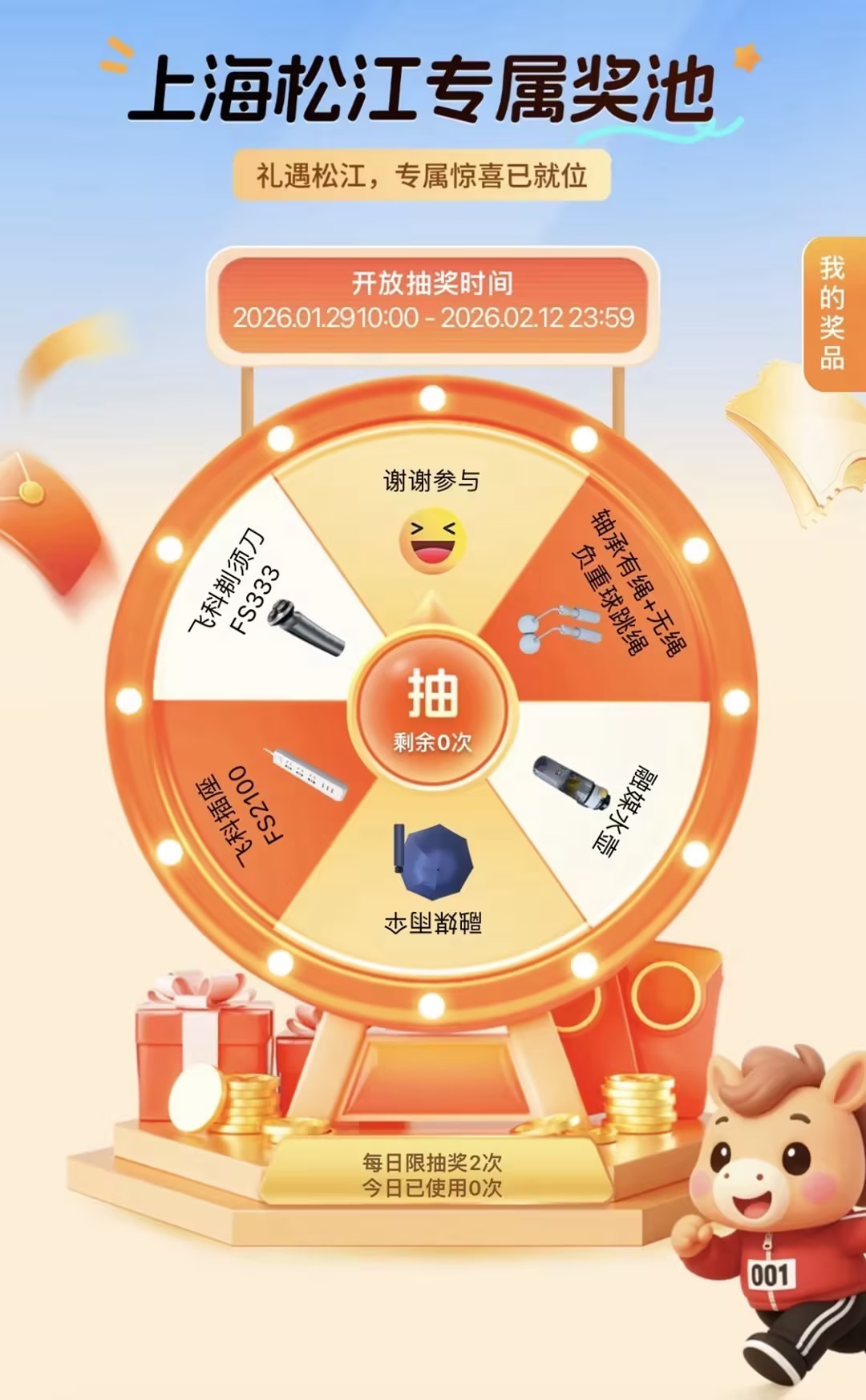 本次松江专属奖池主打“实用+贴心”,奖品包括飞科剃须刀、飞科多功能插座、融媒定制雨伞与水壶,还有适合居家锻炼的跳绳等日常好物,为用户送上一份看得见、用得上的生活“小确幸”。
