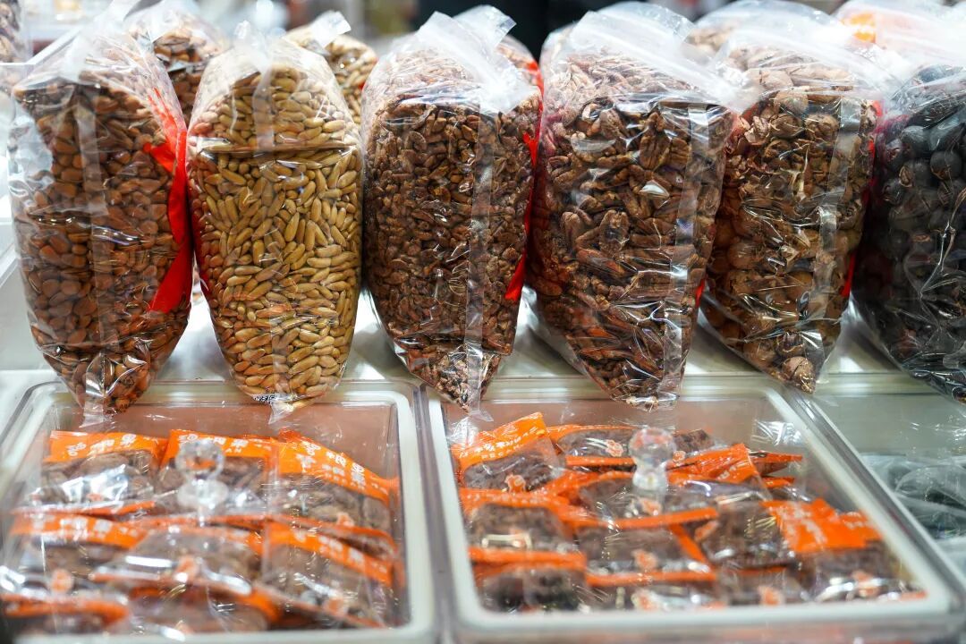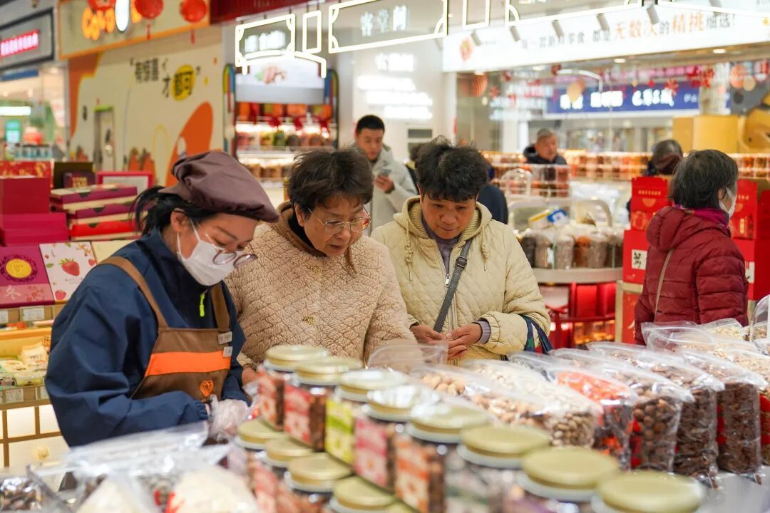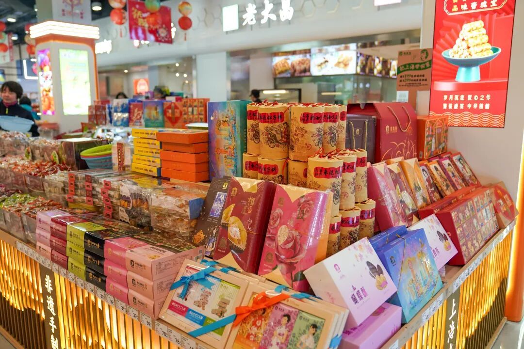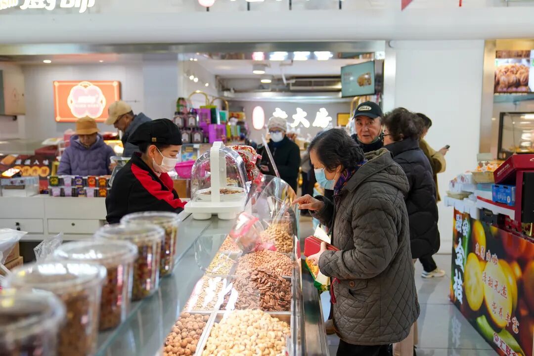 除了熟食与腌腊制品,现炒瓜子花生的摊位前也围满了人,香气四溢;坚果、蜜饯、老字号糕点等传统年货货架前,市民们仔细挑选着礼盒与散装零食,为新春增添甜蜜滋味。