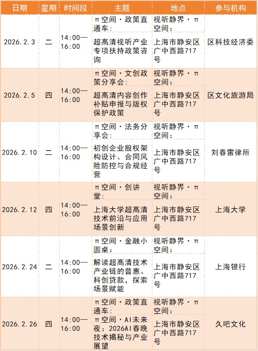 超高清视听产业相关政策咨询、普惠金融互通会、人才政策咨询、文创政策咨询、法务咨询、信贷服务咨询、产教融合沙龙、企业注册咨询、科技创新政策宣讲、OPC创业路径规划、超高清技术讲堂、生成式AI讲堂、特色债券与知识产权融资等。