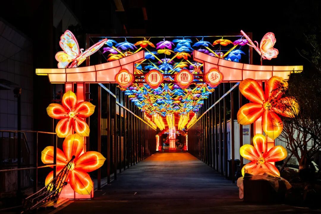 以“花月造梦”为主题的风车长廊里,彩色风车随风簌簌转动,仿佛把风里的好运都转进了新的一年,走在其中满是浪漫。