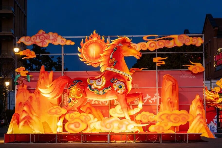再往前走,身披祥云、头顶旭日的火马灯超吸睛,橙红焰纹搭配鎏金彩绘,寓意马年一马当先、万事顺遂,妥妥的拍照打卡C位。
