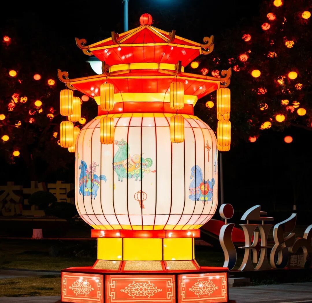 走到市集南门,巨型马年主题灯笼立在街头格外醒目,粉白灯身绘着灵动的骏马,红金相间的顶檐垂挂着精巧小灯,仿佛在诉说“马上有福”的美好期许。