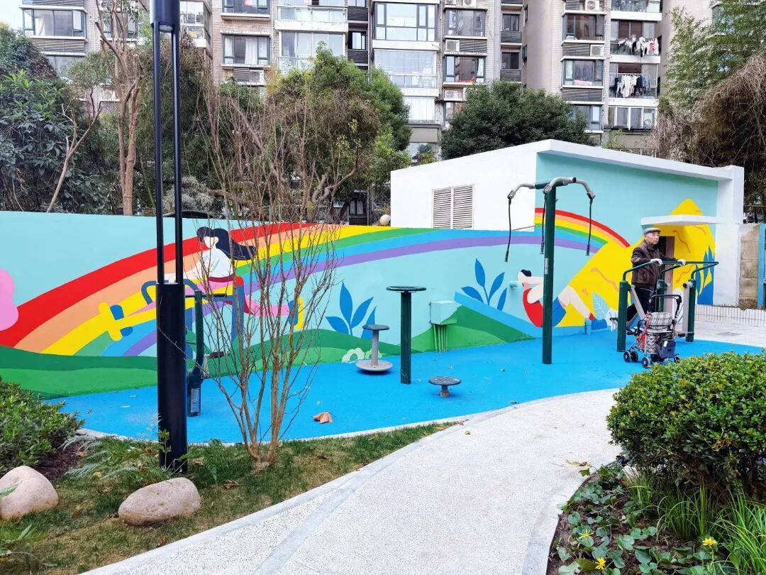 原本废弃的墙面经粉刷彩绘后焕发新生,健身区域重新布局并铺设了环保塑胶地面。